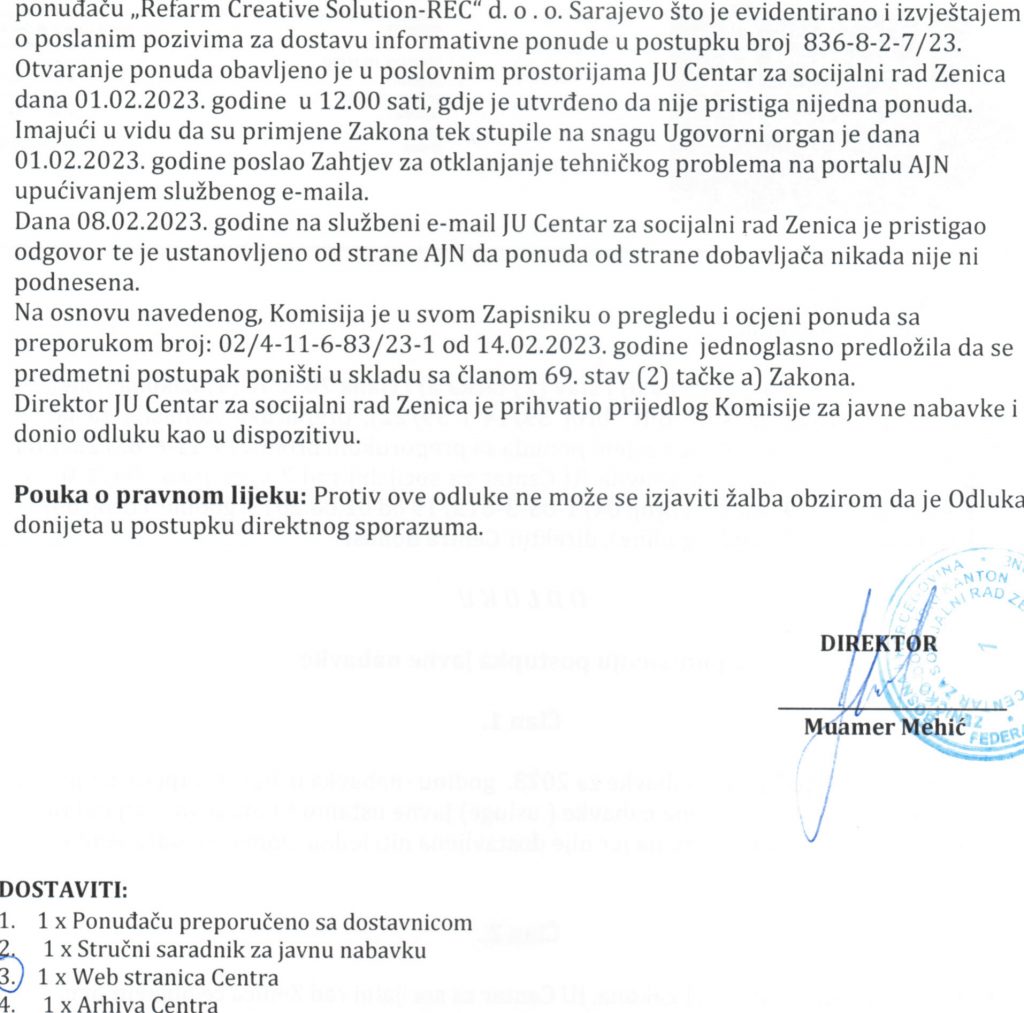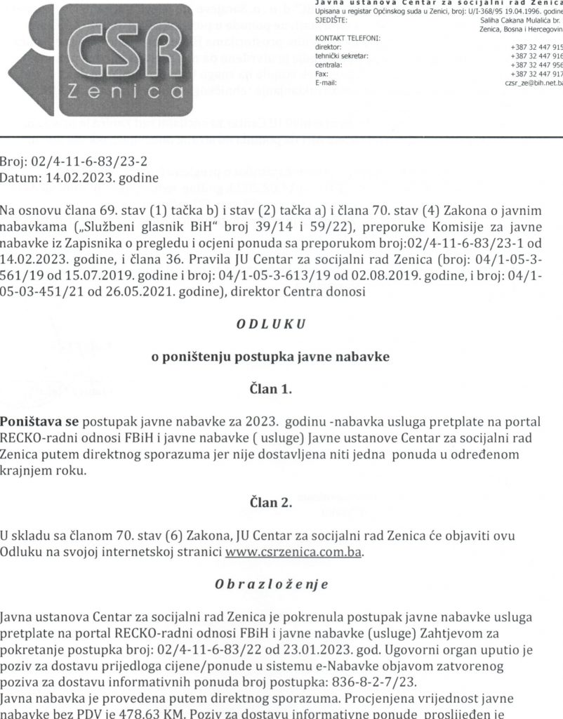 Odluka o poništenju za nabavku usluga pretplate na portal RECKO-radni odnosi FBiH i javne nabavke