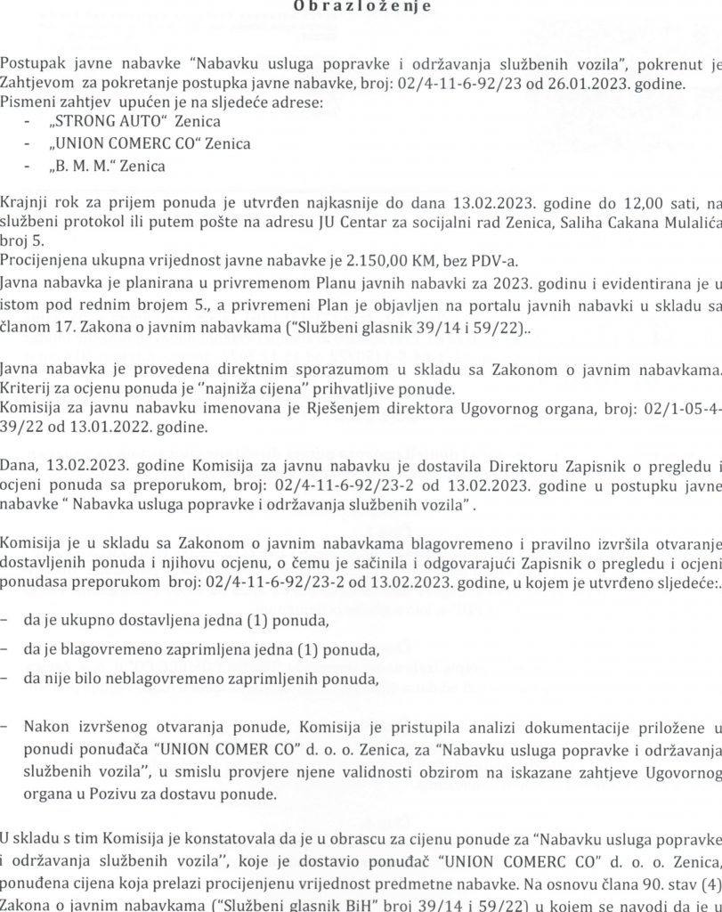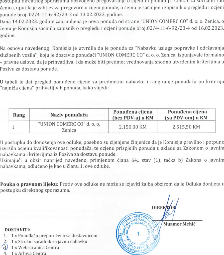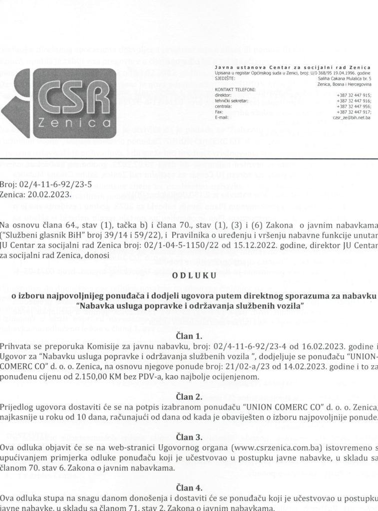 Odluka o izboru najpovoljnijeg ponuđača za nabavku popravke i održavanja službenih vozila