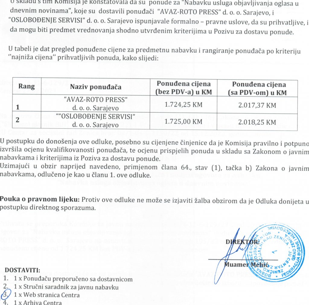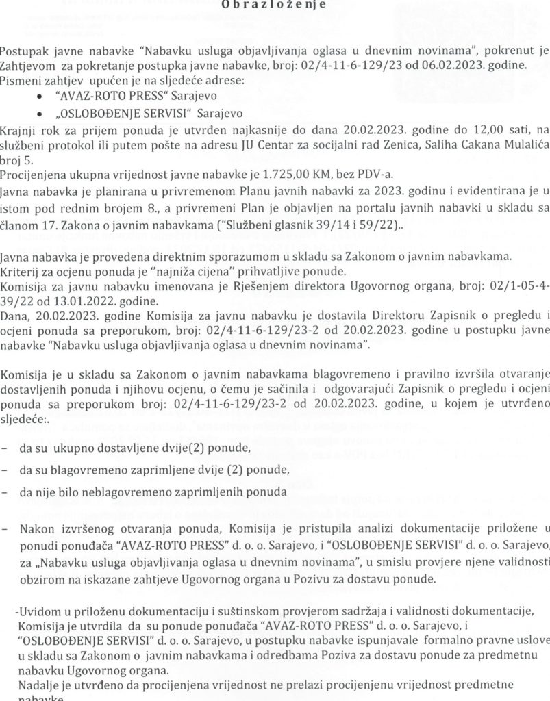 Odluka o izboru najpovoljnijeg ponuđača za nabavku usluga objavljivanja oglasa u dnevnim novinama