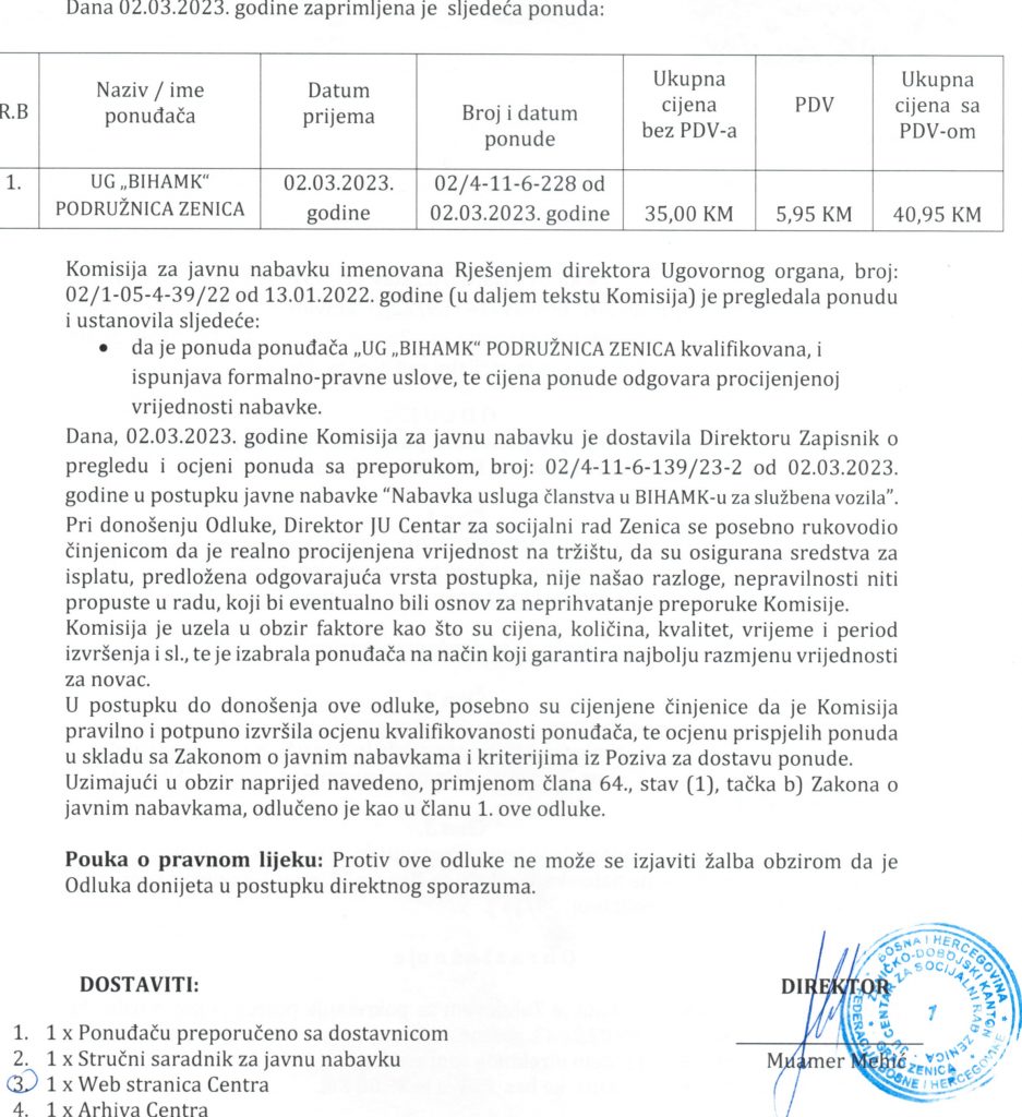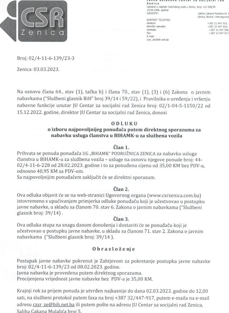 Odluka o izboru najpovoljnijeg ponuđača za nabavku usluga članstva u BIHAMK-u za službena vozila