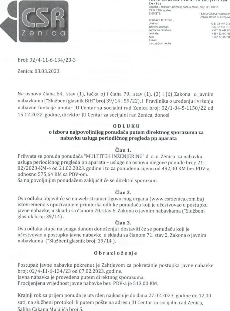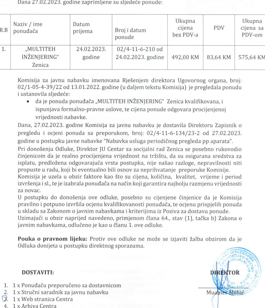 Odluka o izboru najpovoljnijeg ponuđača za nabavku usluga periodičnog pregleda pp aparata