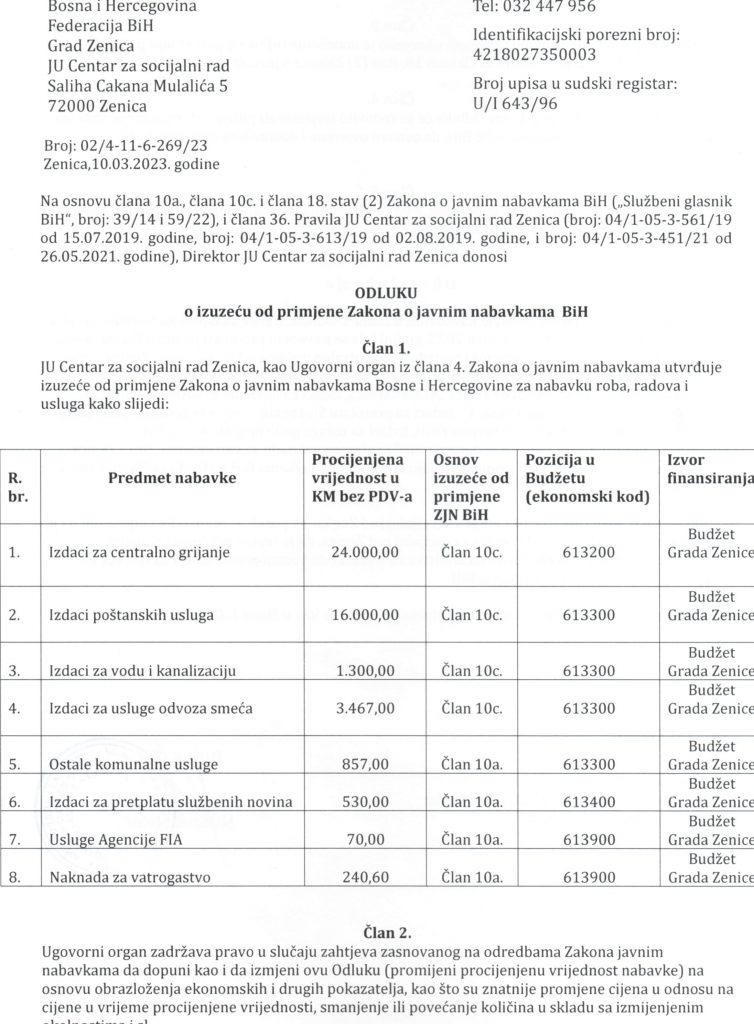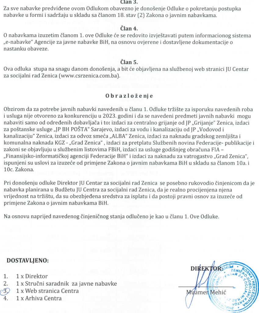 Odluka o pokretanju postupaka javne nabavke koje su izuzete od primjene Zakona o javnim nabavkama i dodjeli ugovora izabranom ponuđaču