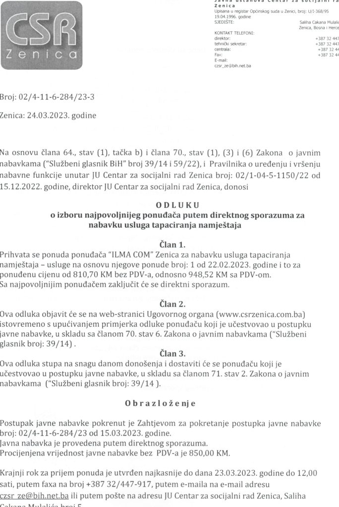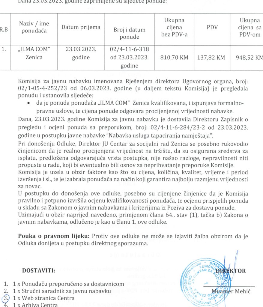 Odluka o izboru najpovoljnijeg ponuđača za nabavku usluga tapaciranja namještaja