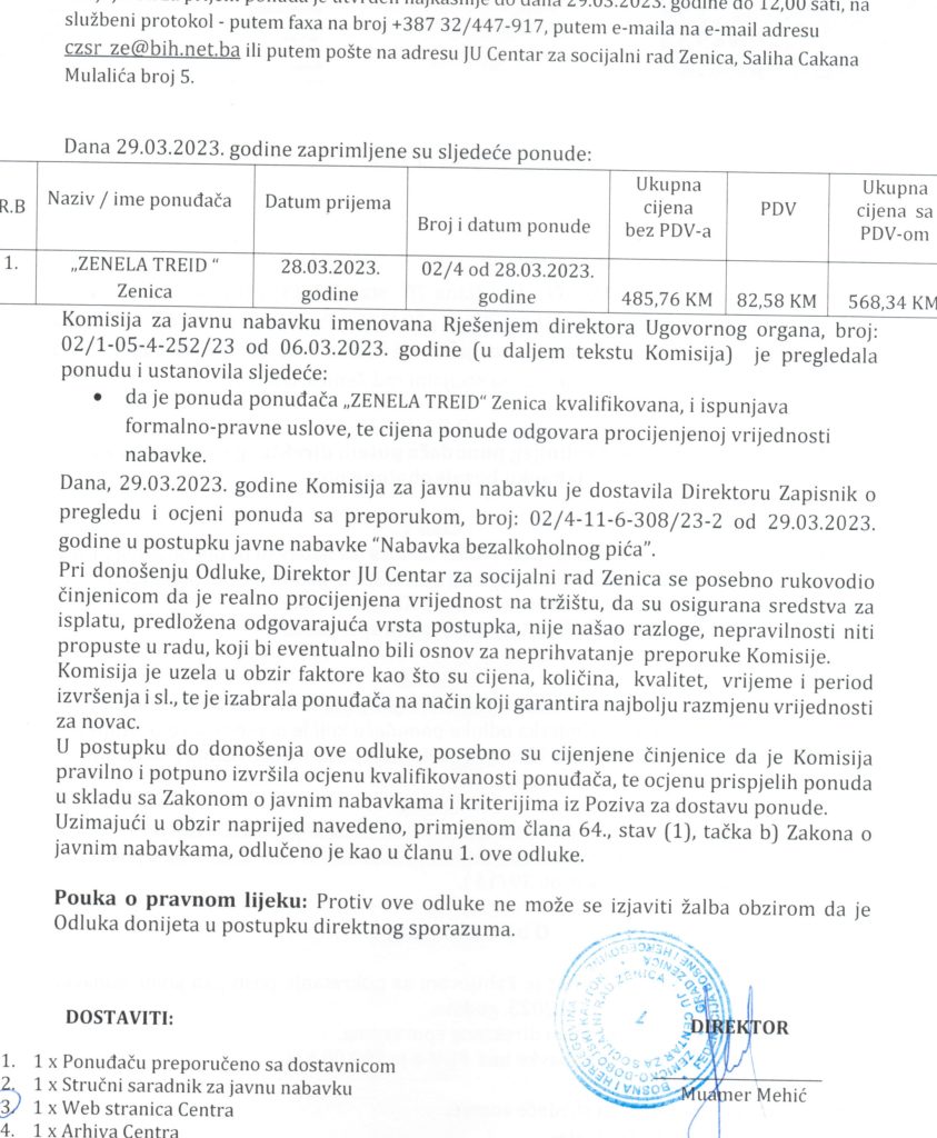 Odluka o izboru najpovoljnijeg ponuđača za nabavku bezalkoholnog pića