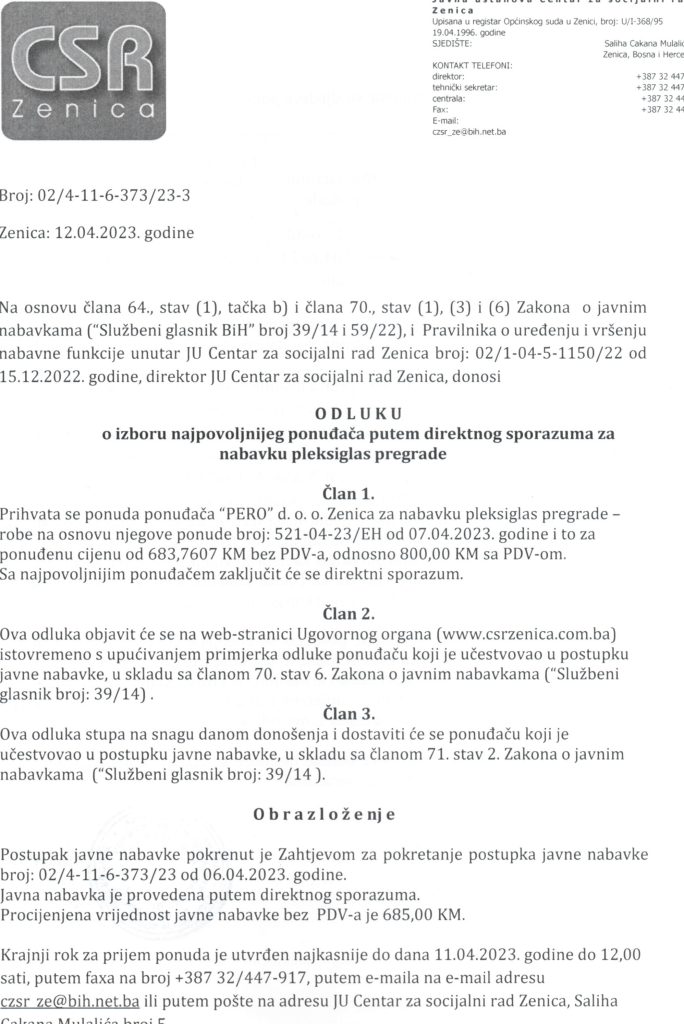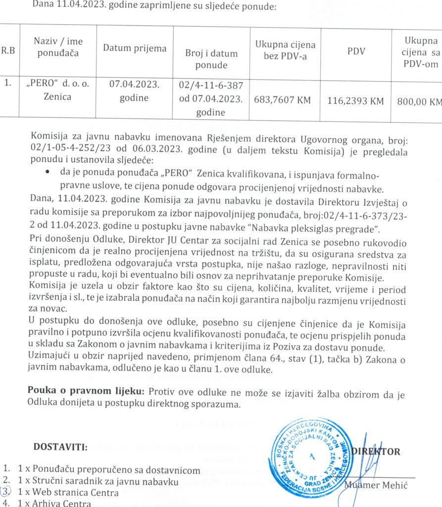Odluka o izboru najpovoljnijeg ponuđača za nabavku pleksiglas pregrade
