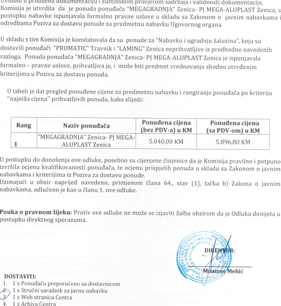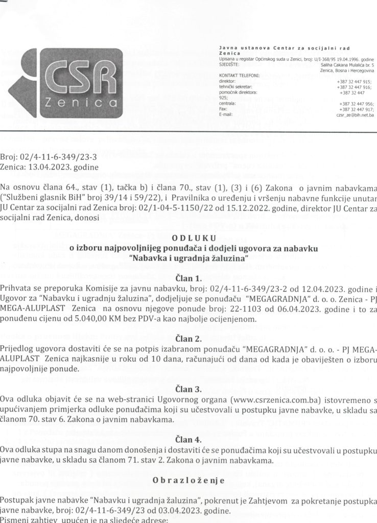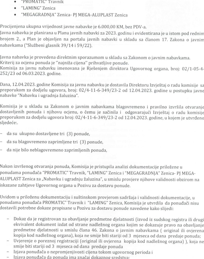 Odluka o izboru najpovoljnijeg ponuđača i dodjeli ugovora za nabavku i ugradnju žaluzina