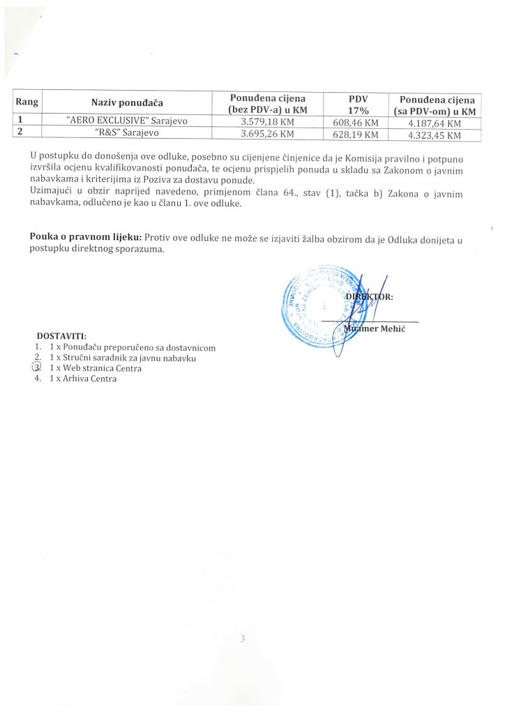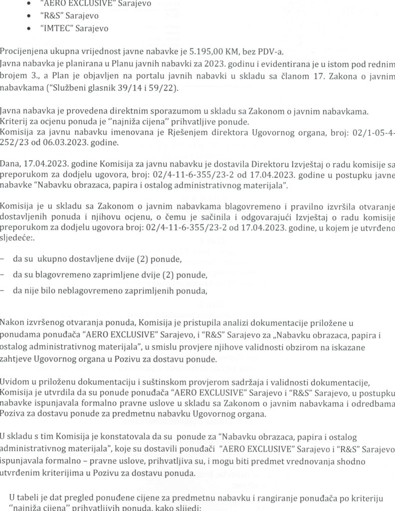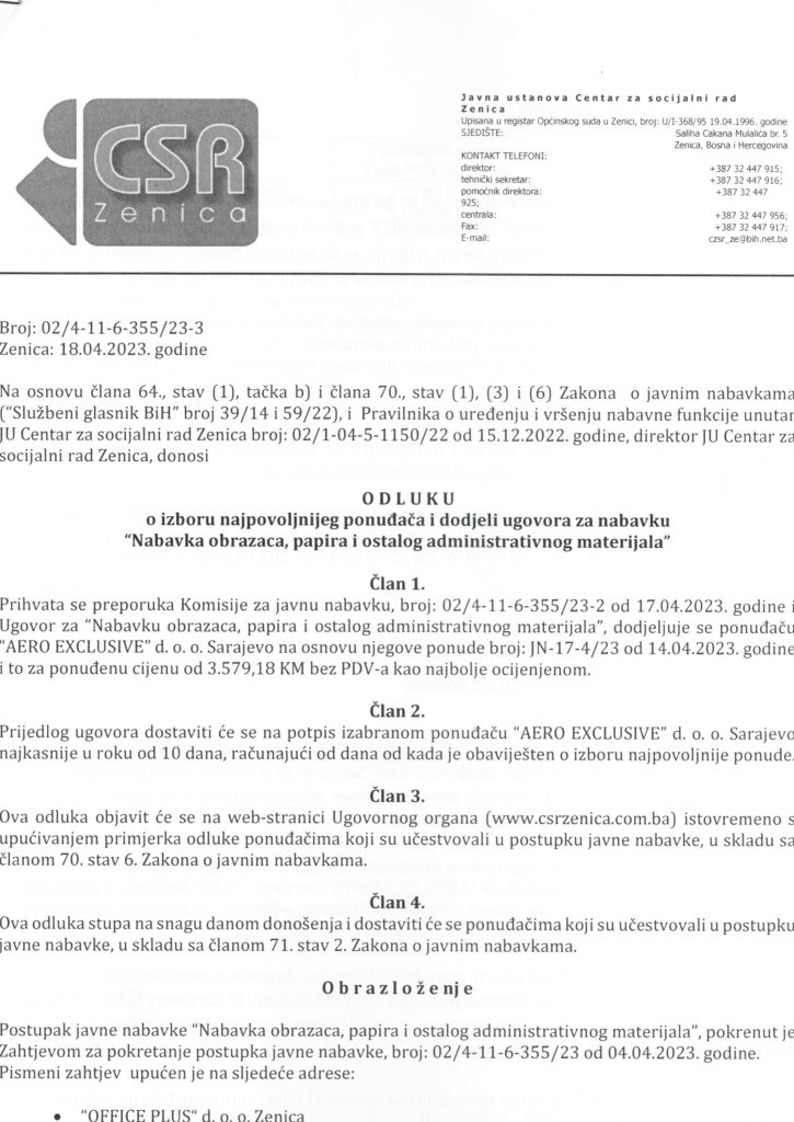 Odluka o izboru najpovoljnijeg ponuđača i dodjeli ugovora za nabavku obrazaca, papira i ostalog administrativnog materijala