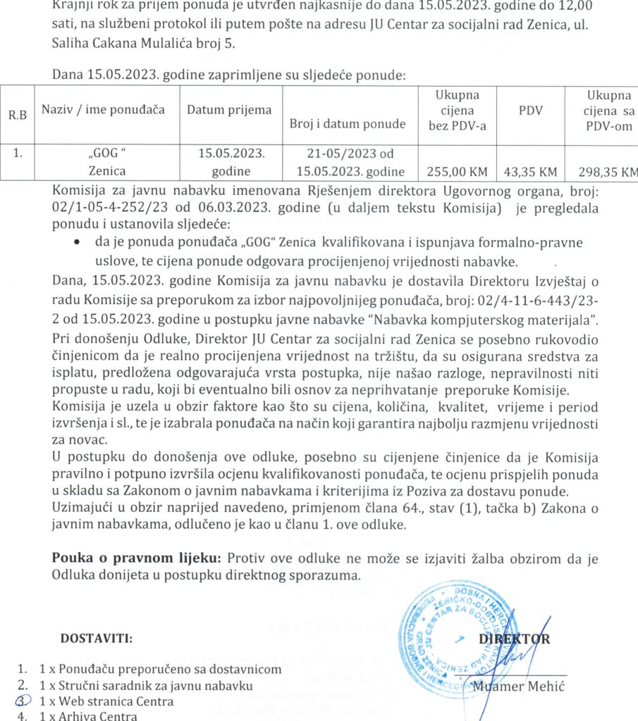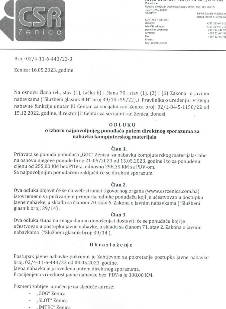 Odluka o izboru najpovoljnijeg ponuđača putem direktnog sporazuma za nabavku kompjuterskog materijala