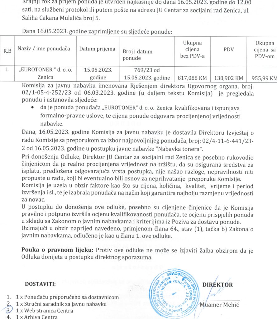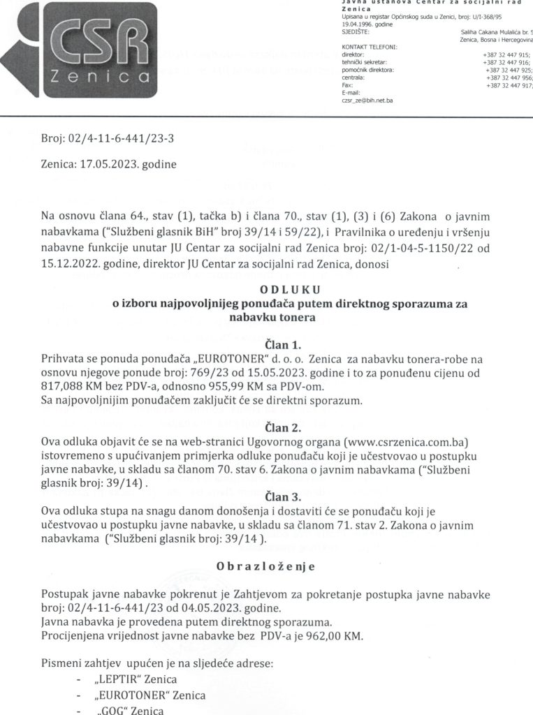 Odluka o izboru najpovoljnijeg ponuđača putem direktnog sporazuma za nabavku tonera