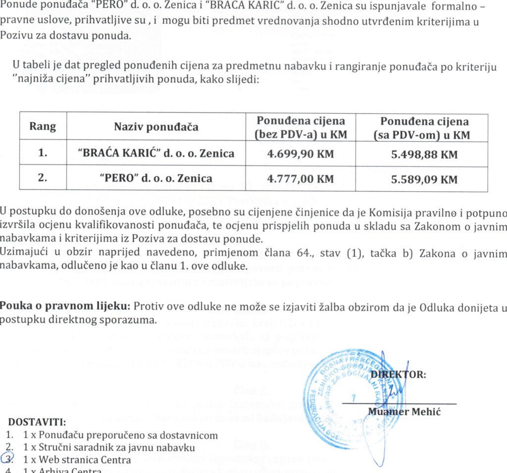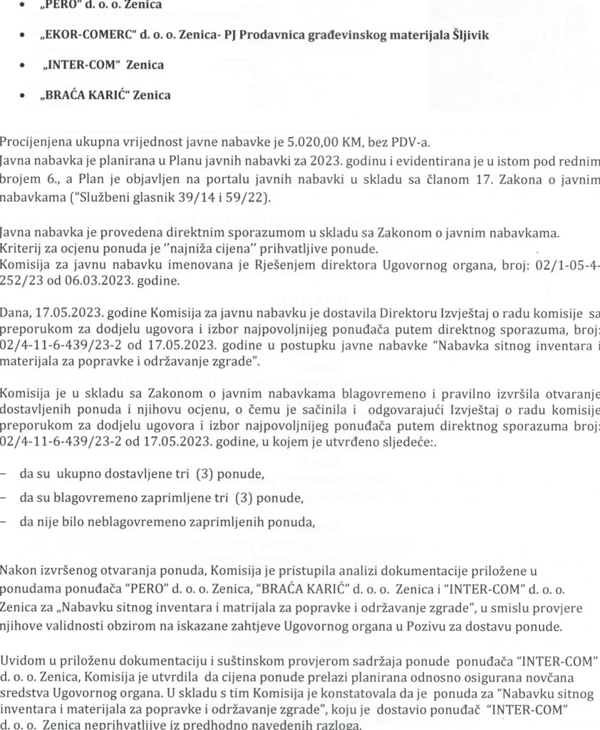 Odluka o izboru najpovoljnijeg ponuđača i dodjeli ugovora putem direktnog sporazuma za nabavku sitnog inventara i materijala za popravke i održavanje zgrade