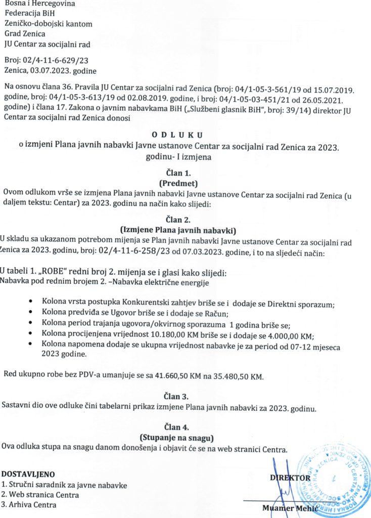 Odluka o I (prvoj) izmjeni Plana javnih nabavki za 2023. godinu