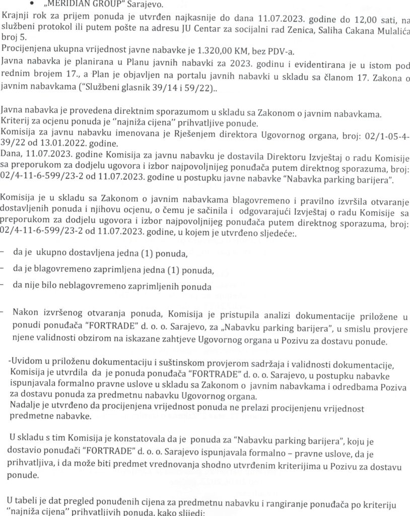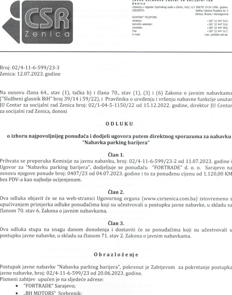 Odluka o izboru najpovoljnijeg ponuđača za nabavku parking barijera
