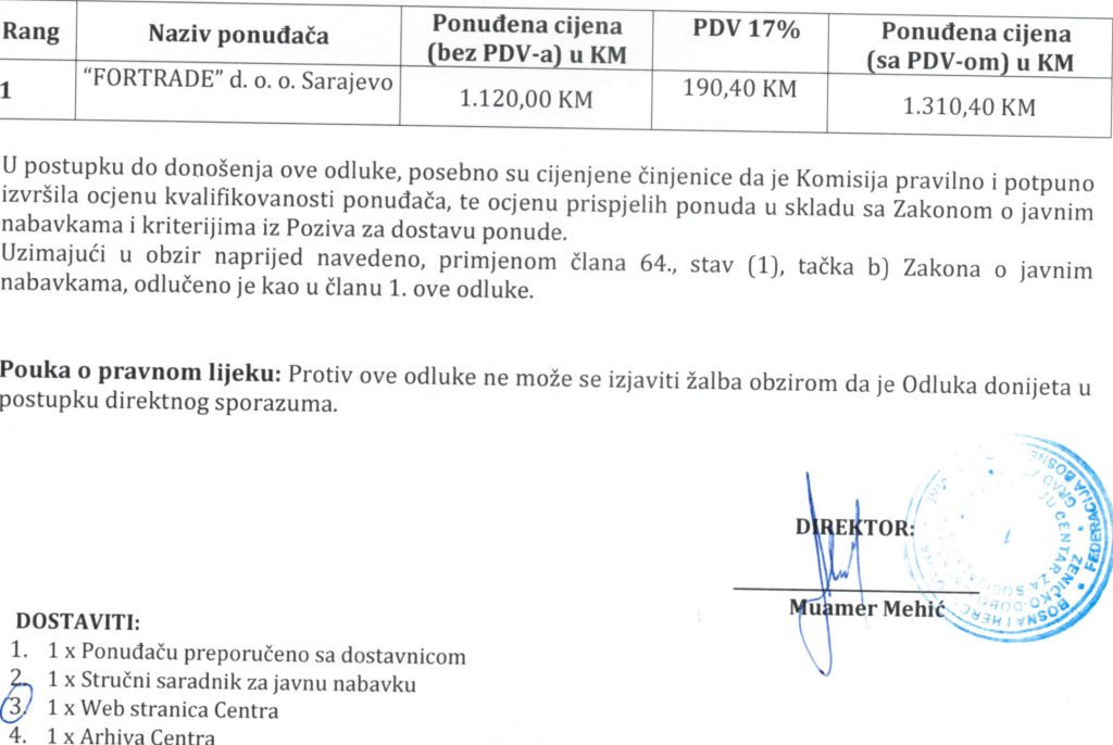 Odluka o izboru najpovoljnijeg ponuđača za nabavku kamera za videonadzor