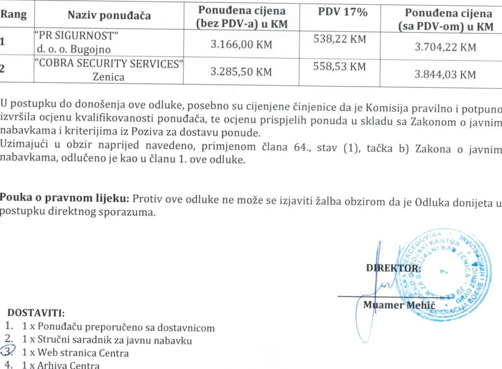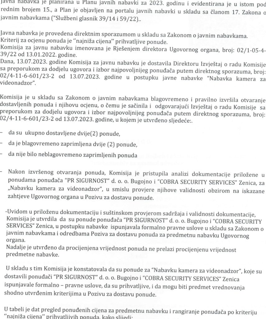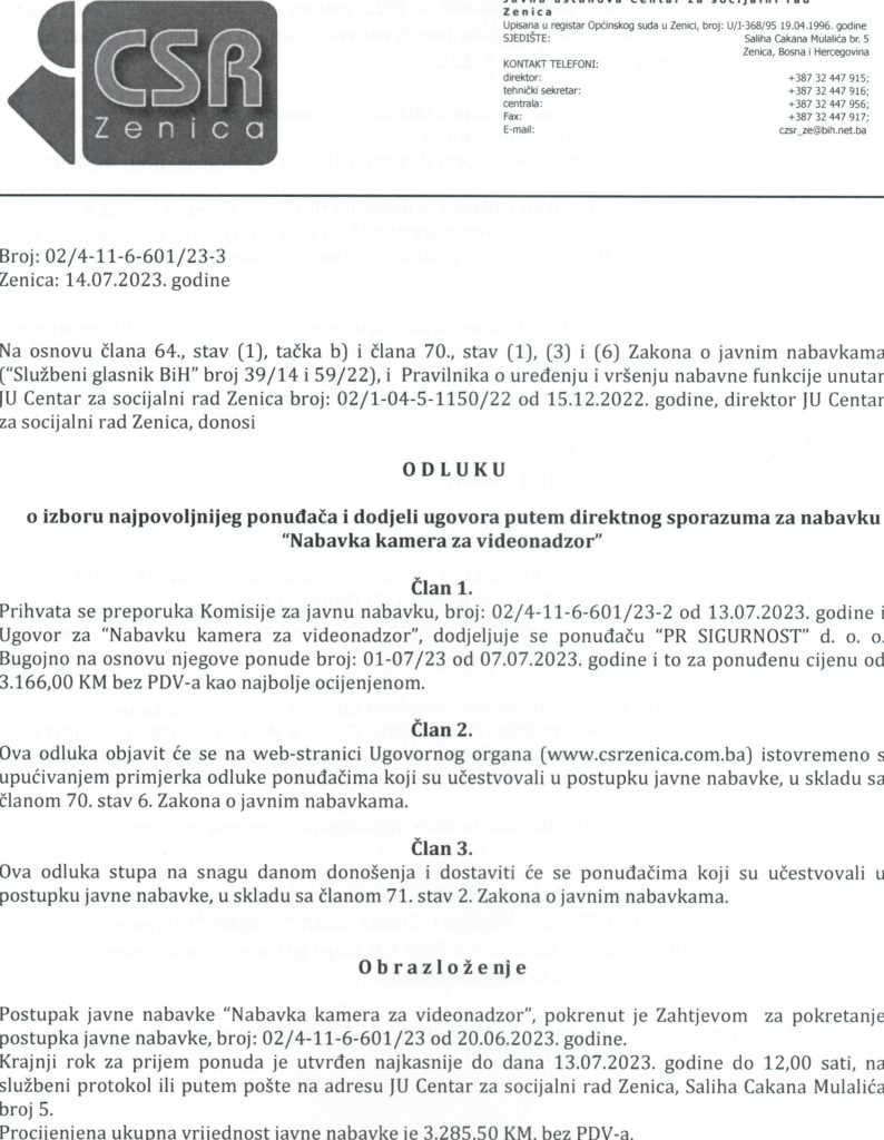 Odluka o izboru najpovoljnijeg ponuđača za nabavku kamera za videonadzor