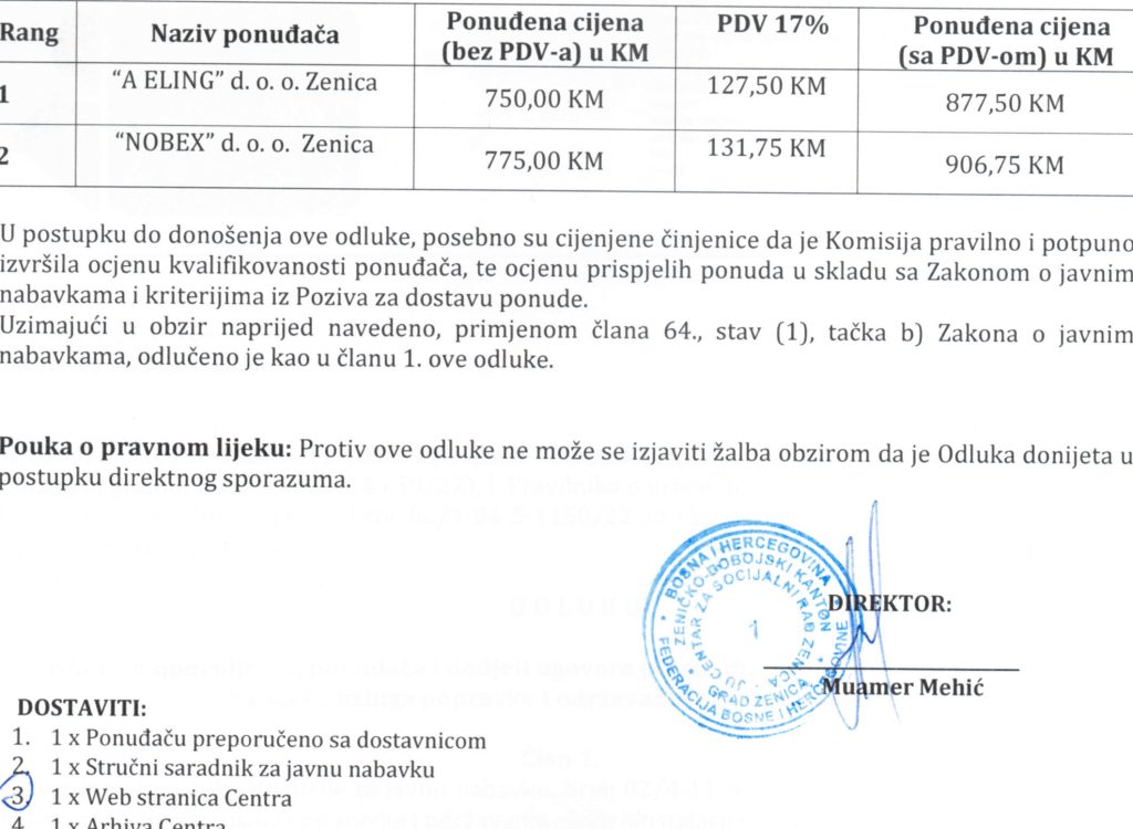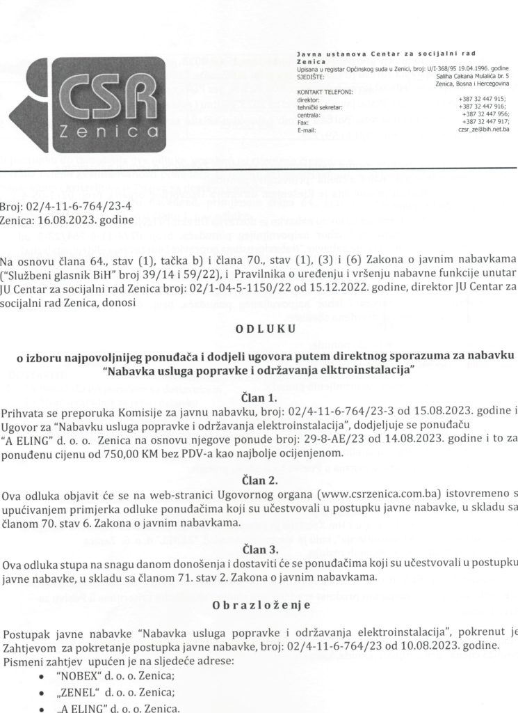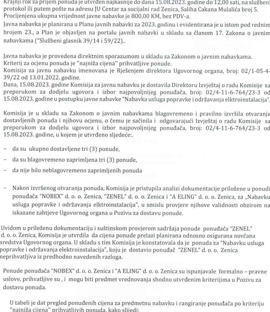 Odluka o izboru najpovoljnijeg ponuđača za nabavku usluga popravke i održavanja elektroinstalacija