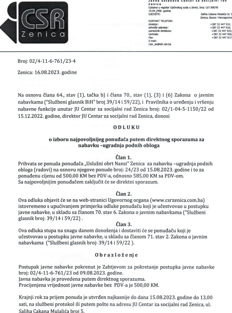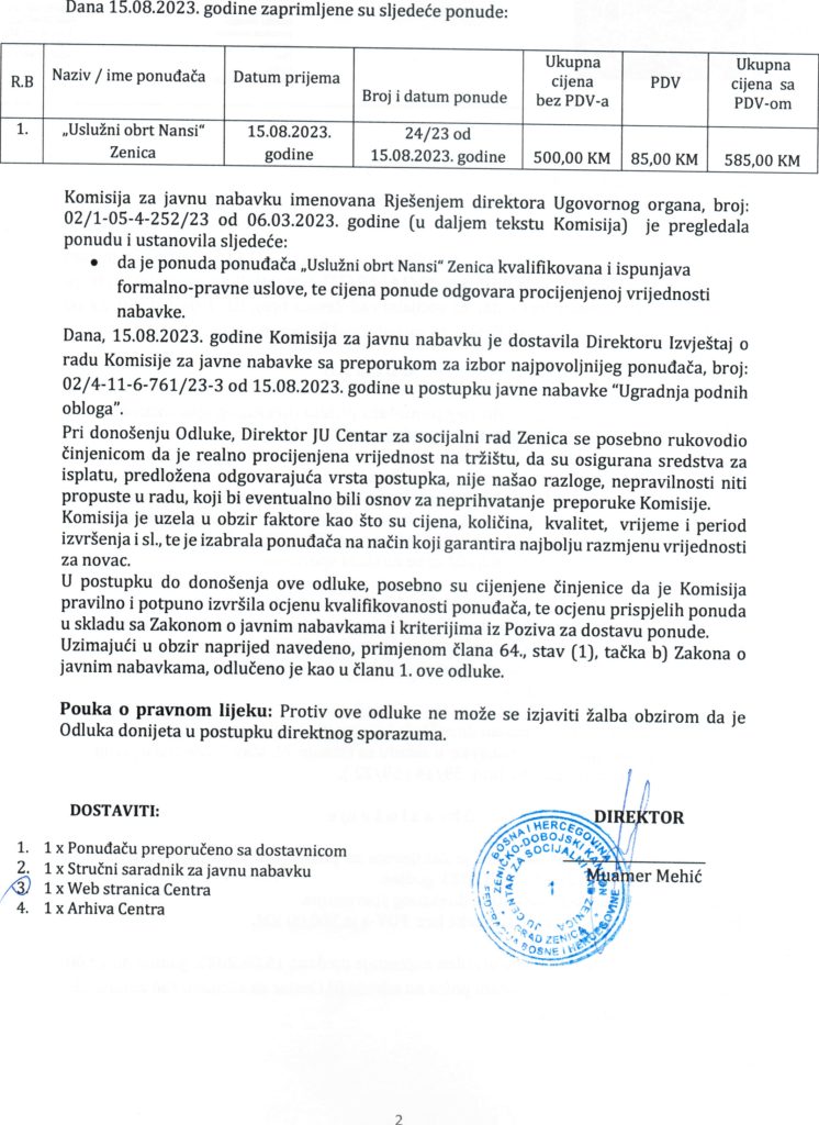 Odluka o izboru najpovoljnijeg ponuđača za nabavku – ugradnju podnih obloga