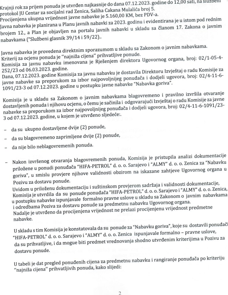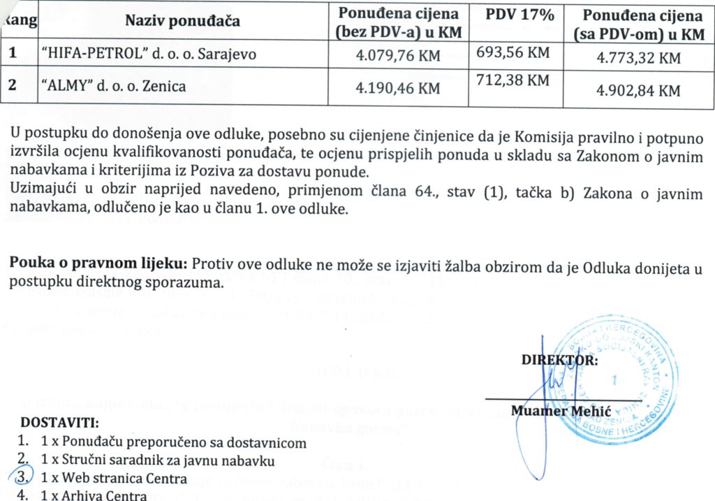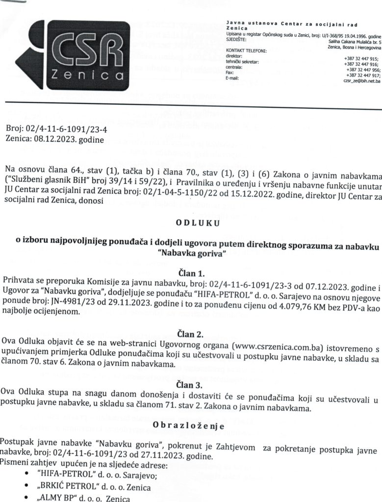 Odluka o izboru najpovoljnijeg ponuđača i dodjeli ugovora putem direktnog sporazuma za “Nabavku goriva”