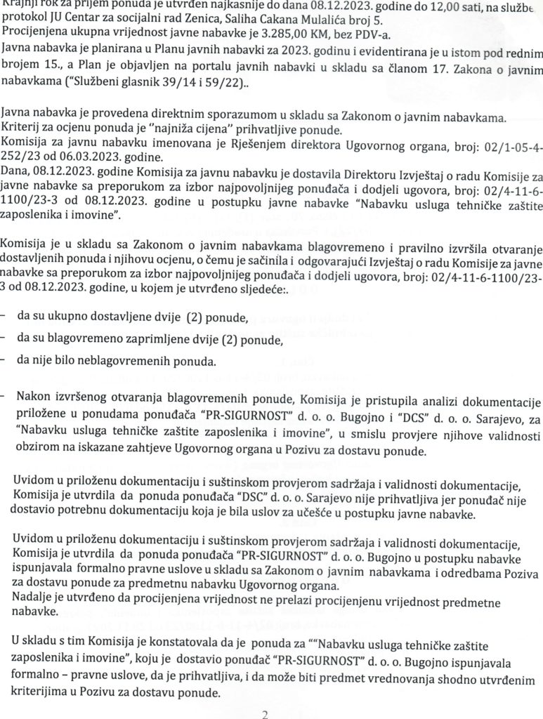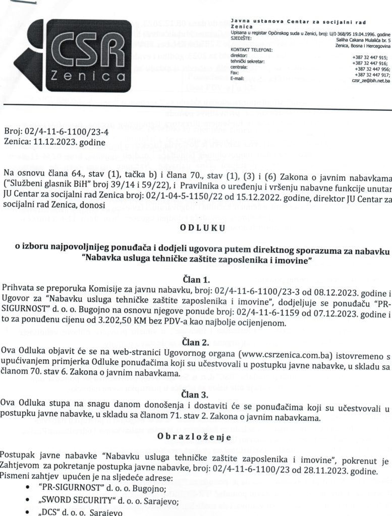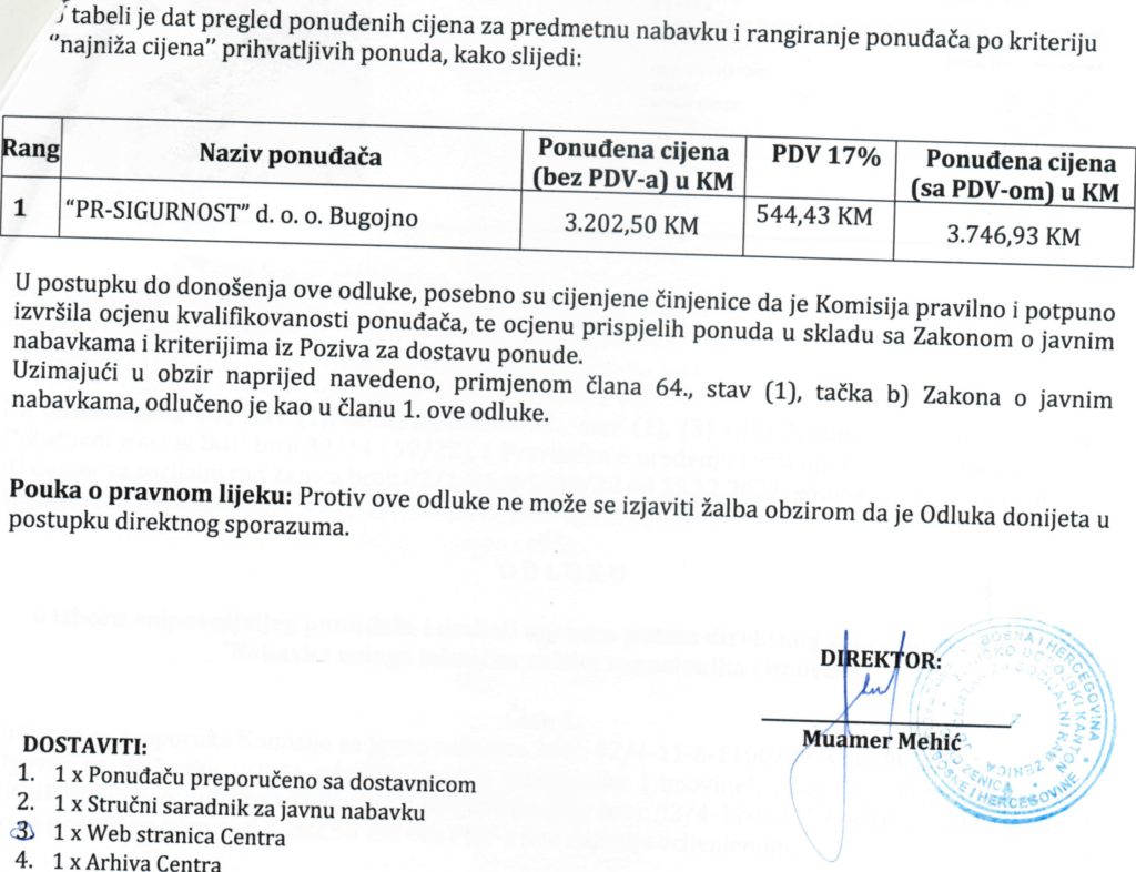 Odluka o izboru najpovoljnijeg ponuđača i dodjeli ugovora putem direktnog sporazuma za “Nabavku usluga tehničke zaštite zaposlenika i imovine”