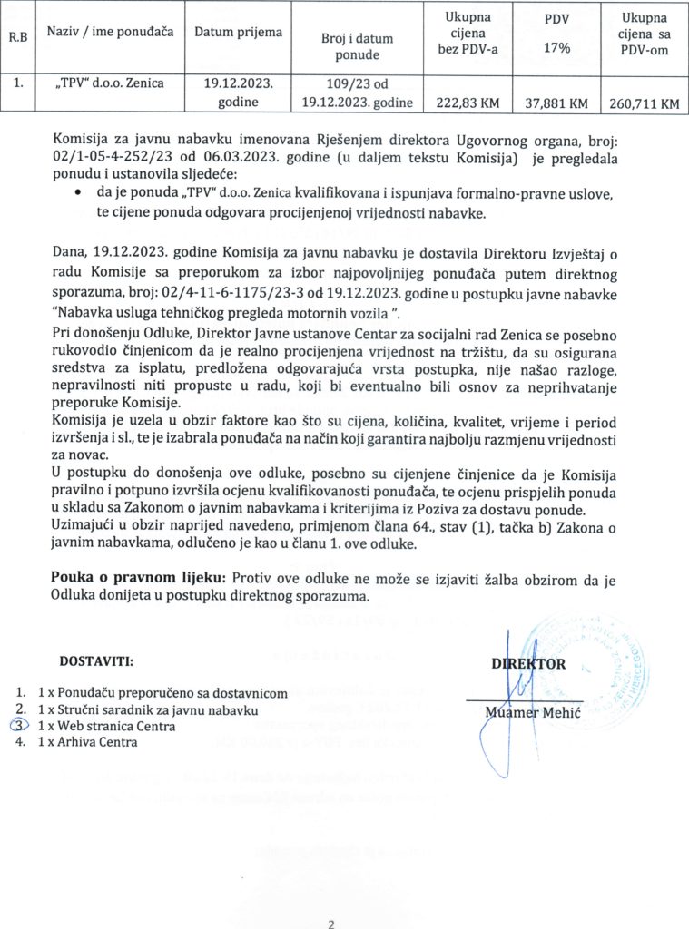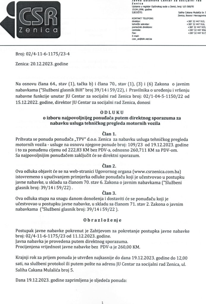 Odluka o izboru najpovoljnijeg ponuđača putem direktnog sporazuma za “Nabavku usluga tehničkog pregleda motornih vozila”