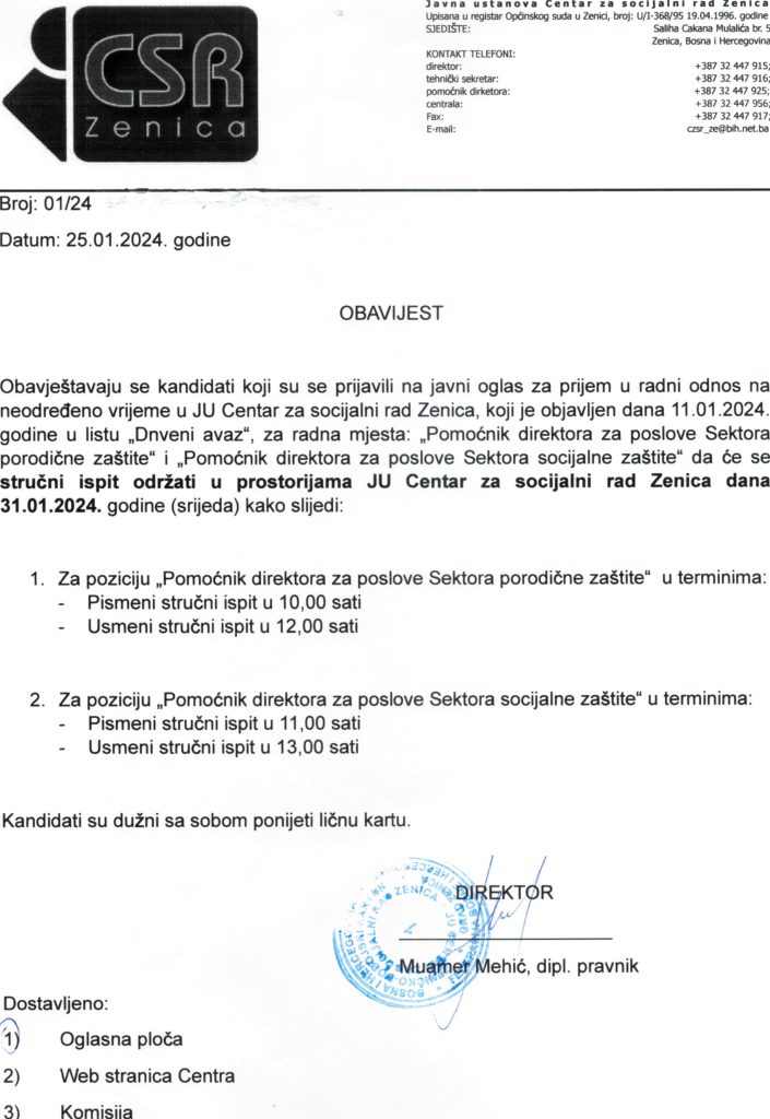 Obavijest o stručnom ispitu za kandidate koji su se prijavili na javni oglas objavljen 11.01.2024. godine u listu “Dnevni avaz”