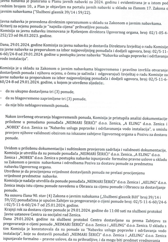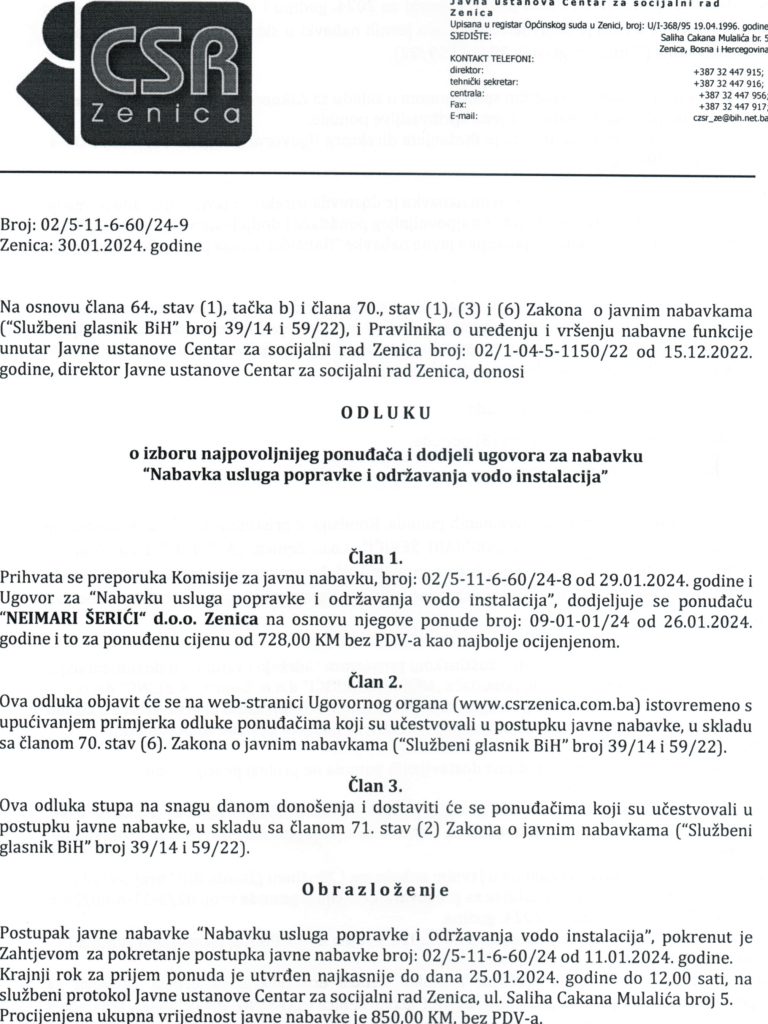 Odluka o izboru najpovoljnijeg ponuđača i dodjeli ugovora putem direktnog sporazuma za “Nabavku usluga popravke i održavanja vodo instalacija”