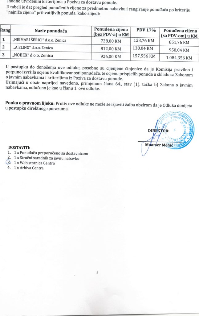 Odluka o izboru najpovoljnijeg ponuđača i dodjeli ugovora putem direktnog sporazuma za “Nabavku usluga popravke i održavanja službenih vozila”