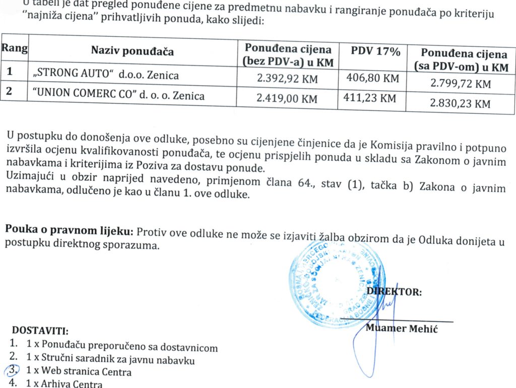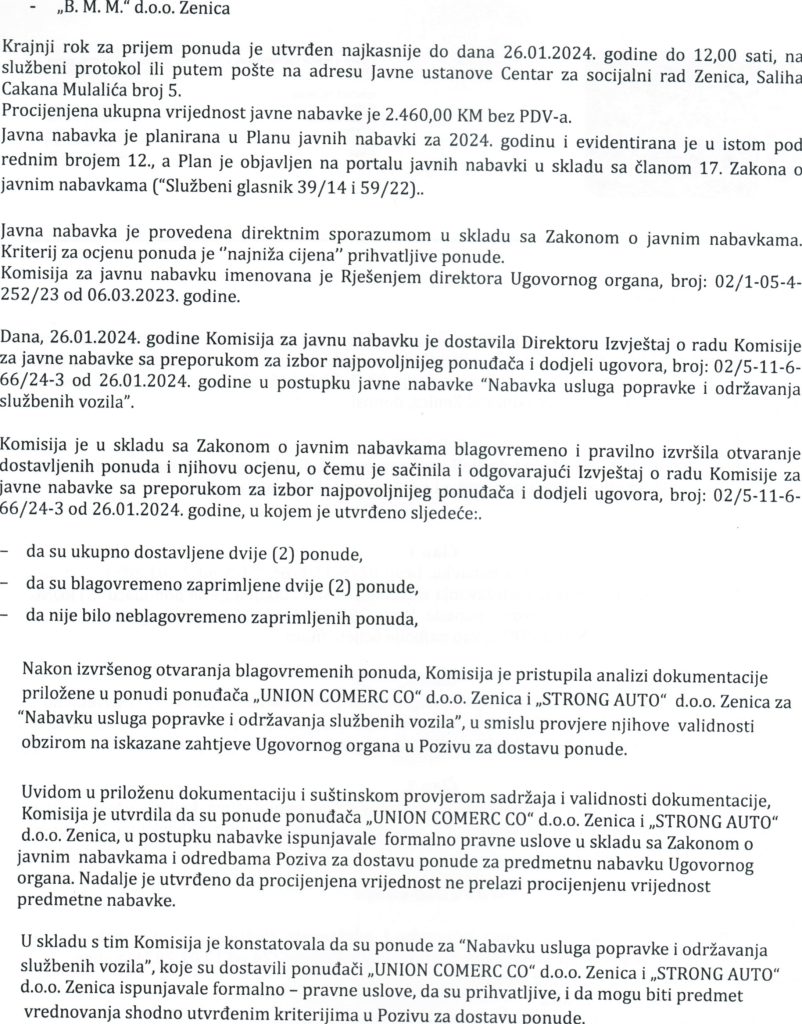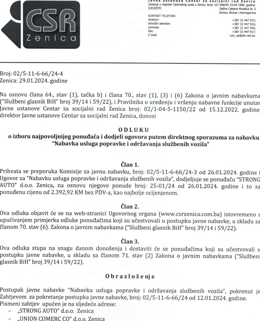 Odluka o izboru najpovoljnijeg ponuđača i dodjeli ugovora putem direktnog sporazuma za “Nabavku usluga popravke i održavanja službenih vozila”