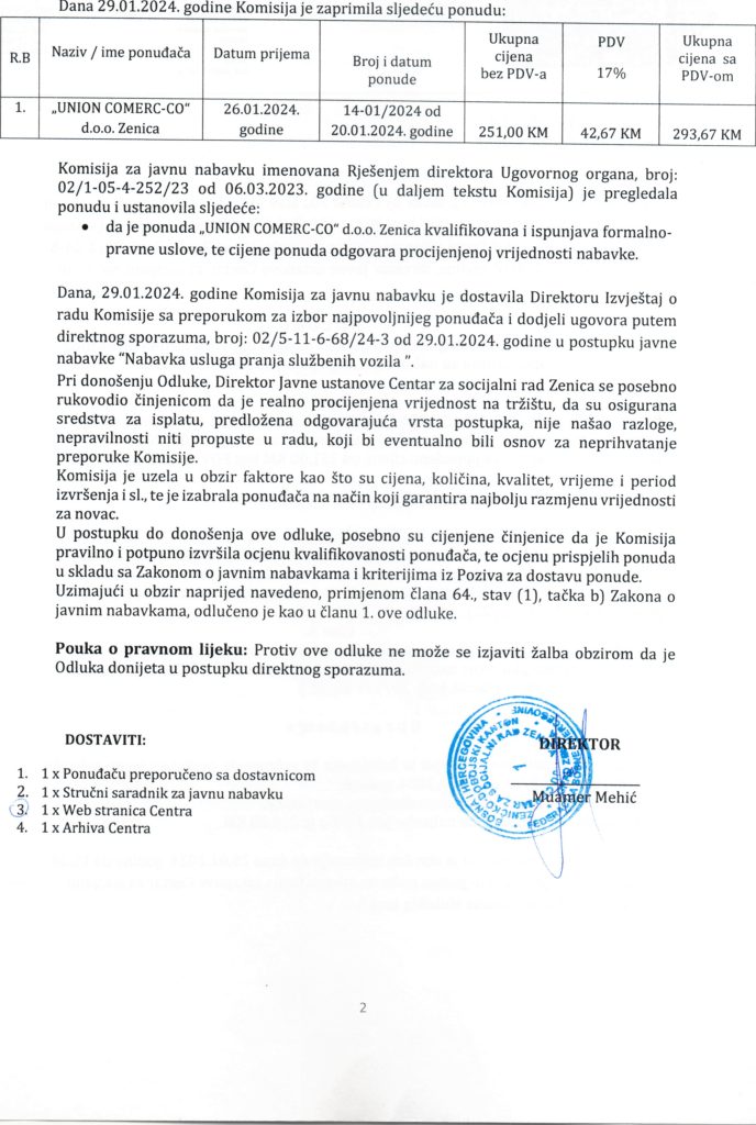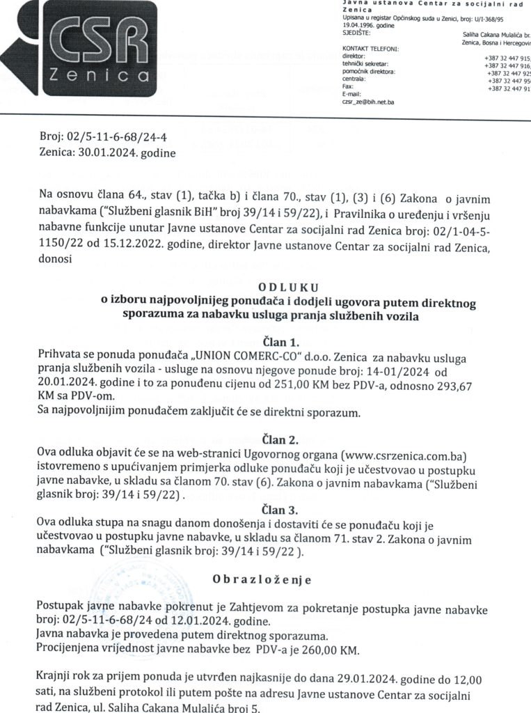 Odluka o izboru najpovoljnijeg ponuđača i dodjeli ugovora putem direktnog sporazuma za “Nabavku usluga pranja službenih vozila”