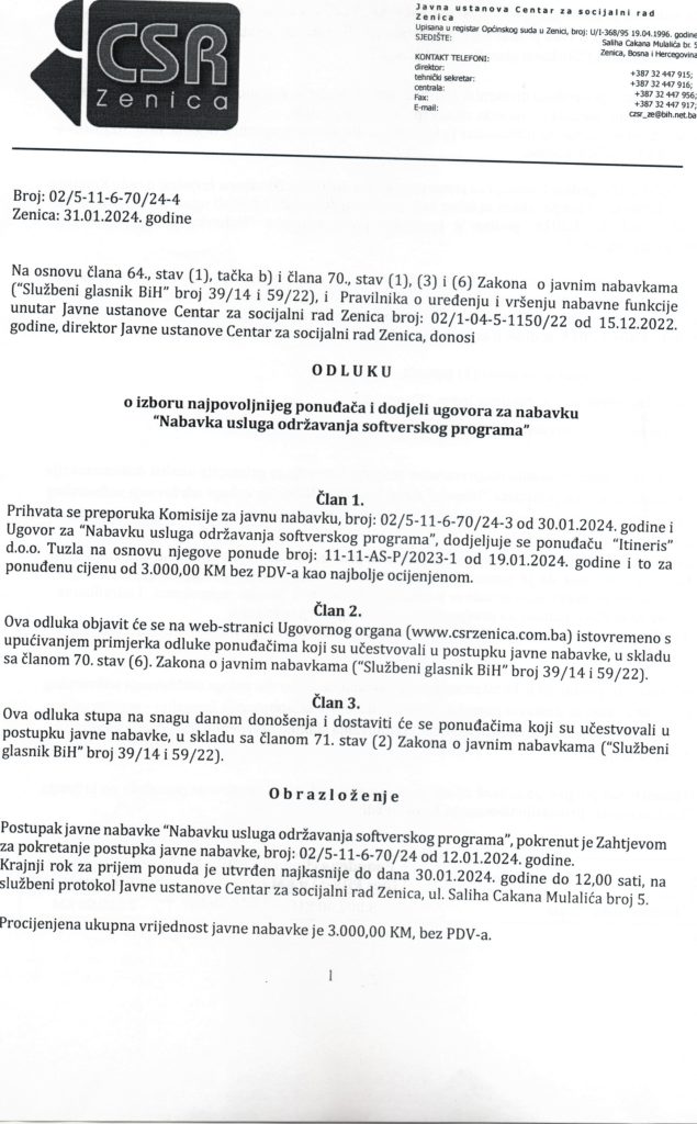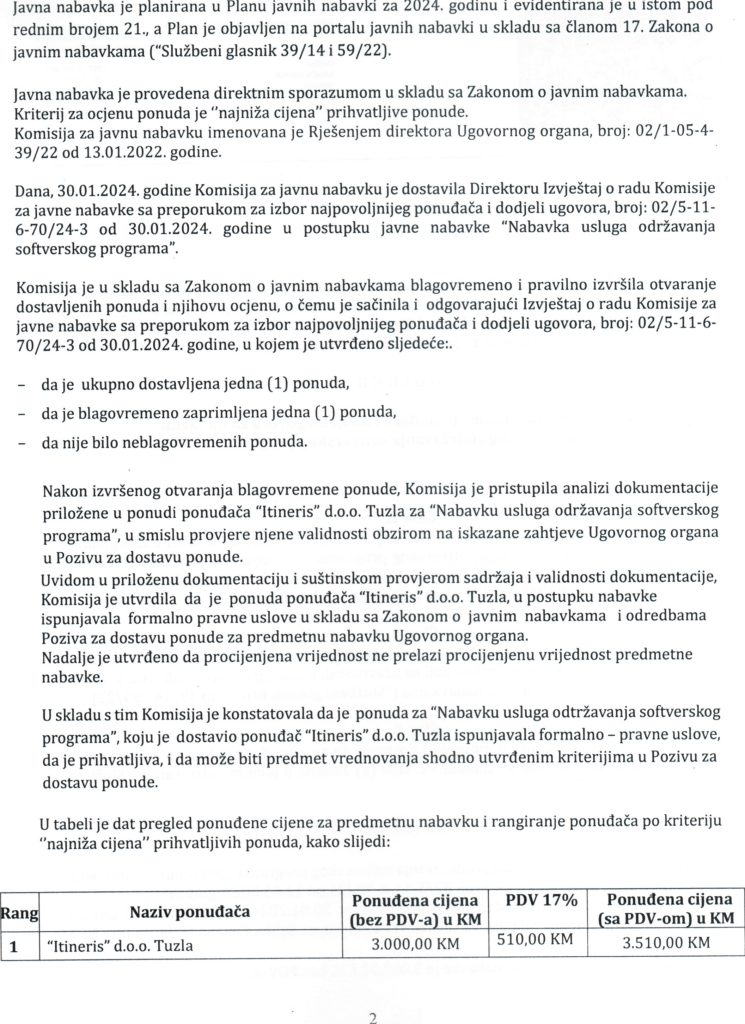Odluka o izboru najpovoljnijeg ponuđača i dodjeli ugovora putem direktnog sporazuma za “Nabavku usluga održavanja softverskog programa”
