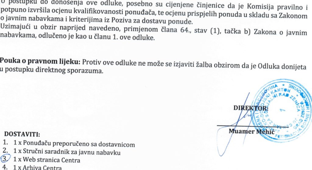Odluka o izboru najpovoljnijeg ponuđača i dodjeli ugovora putem direktnog sporazuma za “Nabavku usluga popravke i održavanja kompjuterske opreme”
