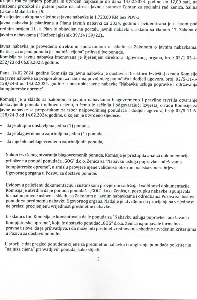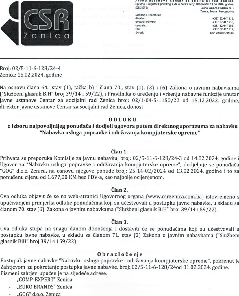 Odluka o izboru najpovoljnijeg ponuđača i dodjeli ugovora putem direktnog sporazuma za “Nabavku usluga popravke i održavanja kompjuterske opreme”