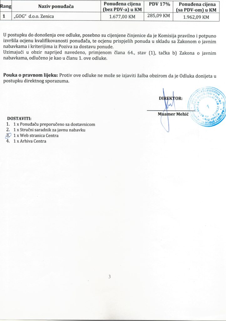 Odluka o izboru najpovoljnijeg ponuđača i dodjeli ugovora putem direktnog sporazuma za “Nabavku obrazaca, papira i ostalog administrativnog materijala”