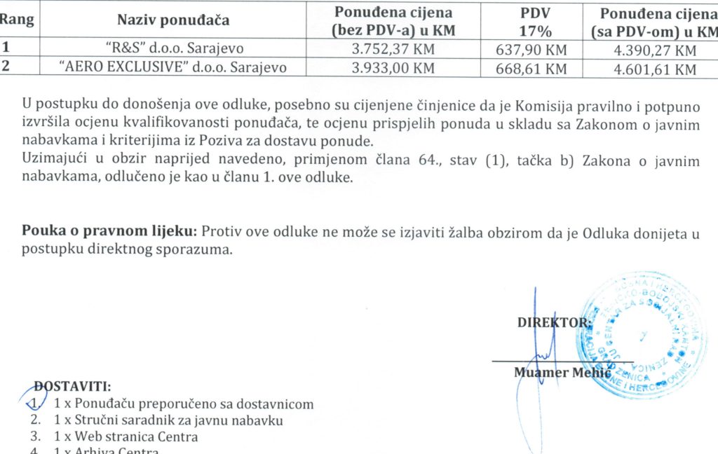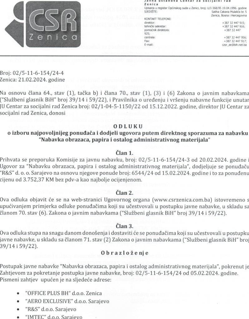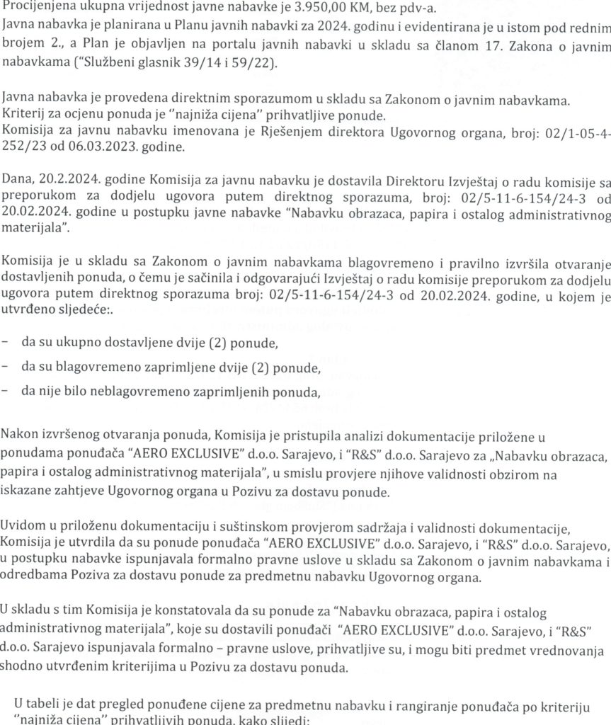 Odluka o izboru najpovoljnijeg ponuđača i dodjeli ugovora putem direktnog sporazuma za “Nabavku obrazaca, papira i ostalog administrativnog materijala”