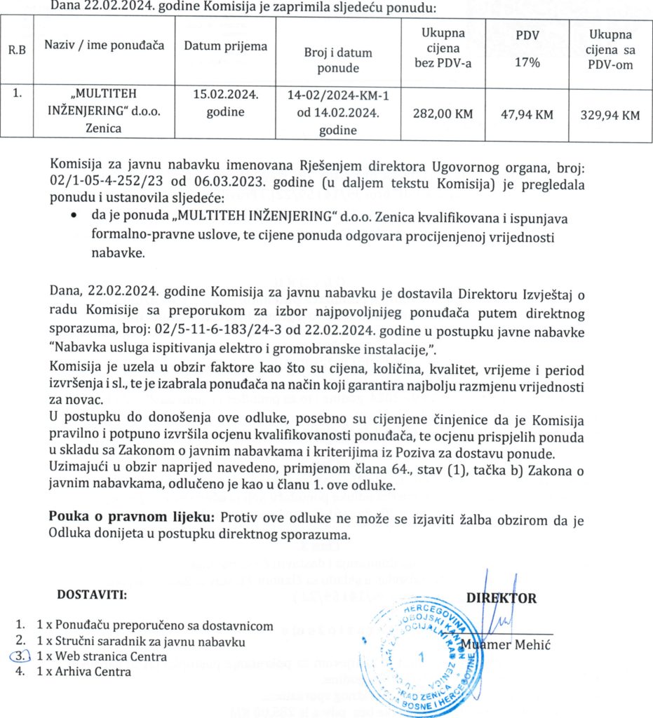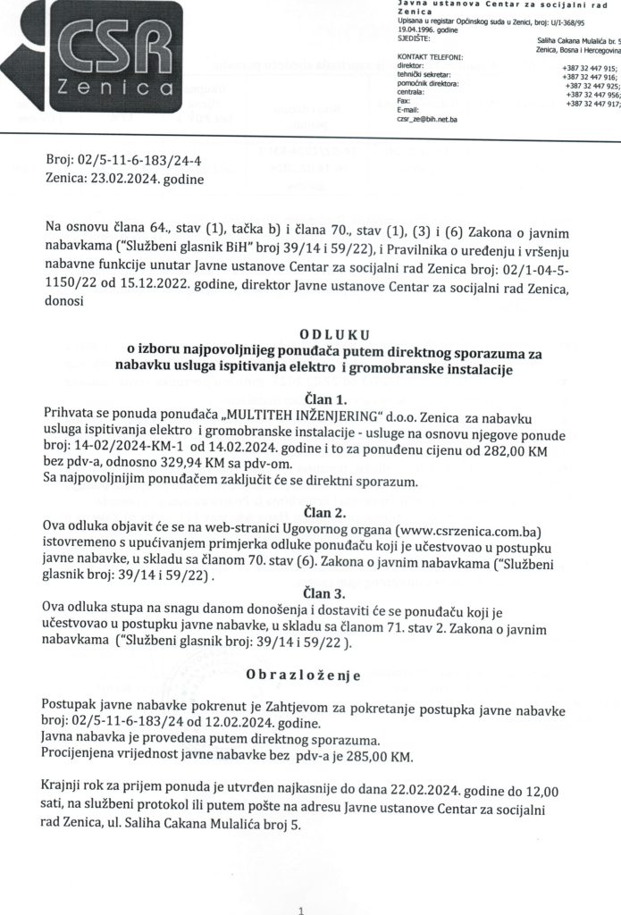 Odluka o izboru najpovoljnijeg ponuđača putem direktnog sporazuma za “Nabavku usluga ispitivanja elektro i gromobranske instalacije”