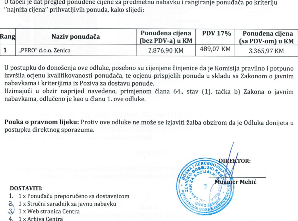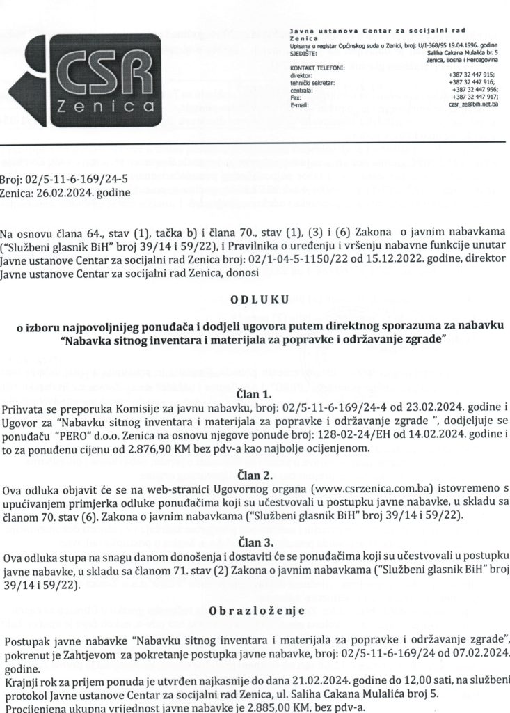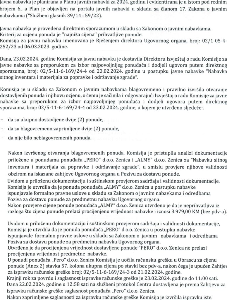Odluka o izboru najpovoljnijeg ponuđača i dodjeli ugovora putem direktnog sporazuma za “Nabavku sitnog inventara i materijala za popravke i održavanje zgrade”