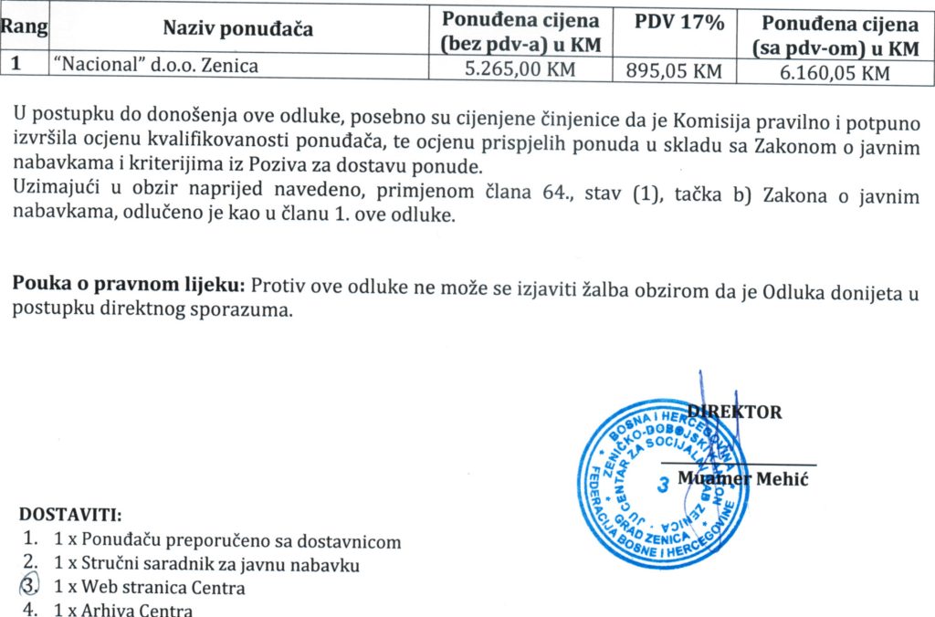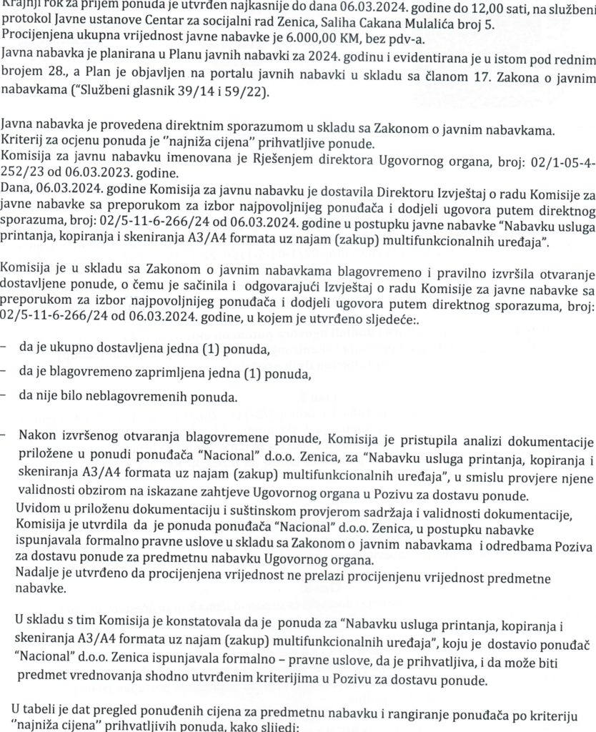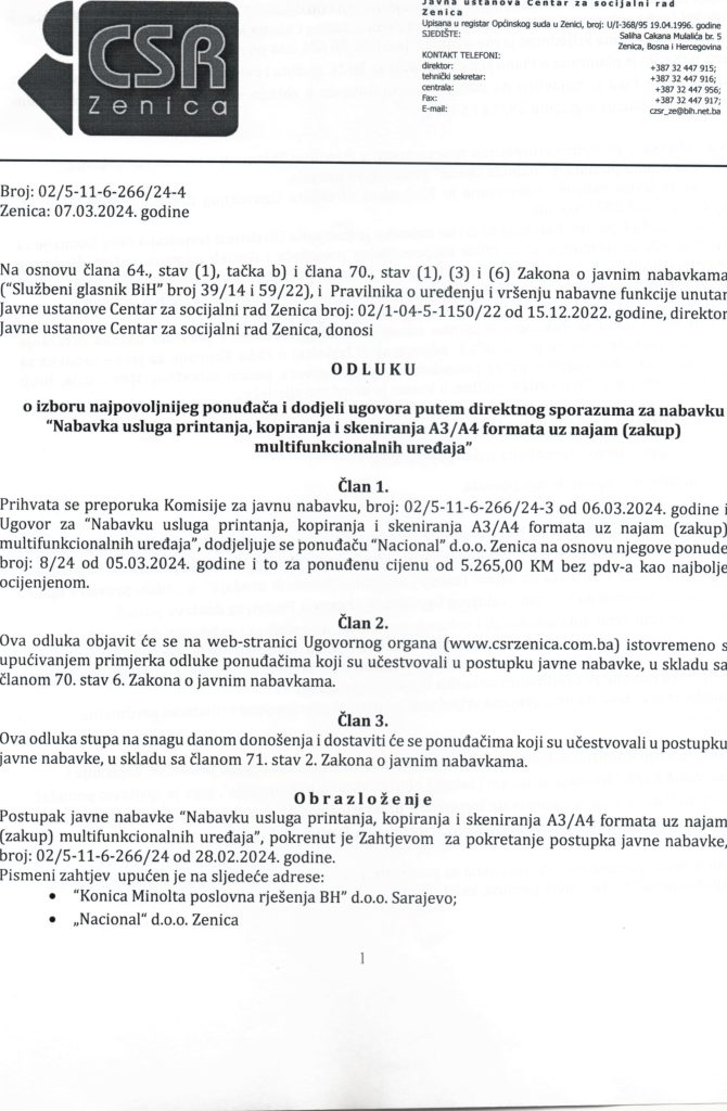 Odluka o izboru najpovoljnijeg ponuđača i dodjeli ugovora putem direktnog sporazuma za “Nabavku usluga printanja, kopiranja i skeniranja A3/A4 formata uz najam(zakup) multifunkcionalnih uređaja”