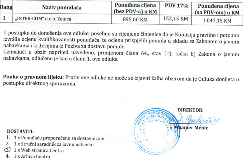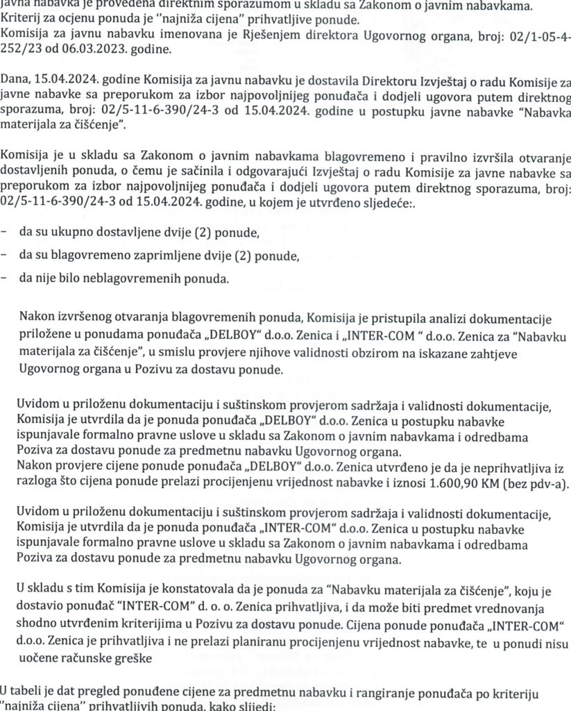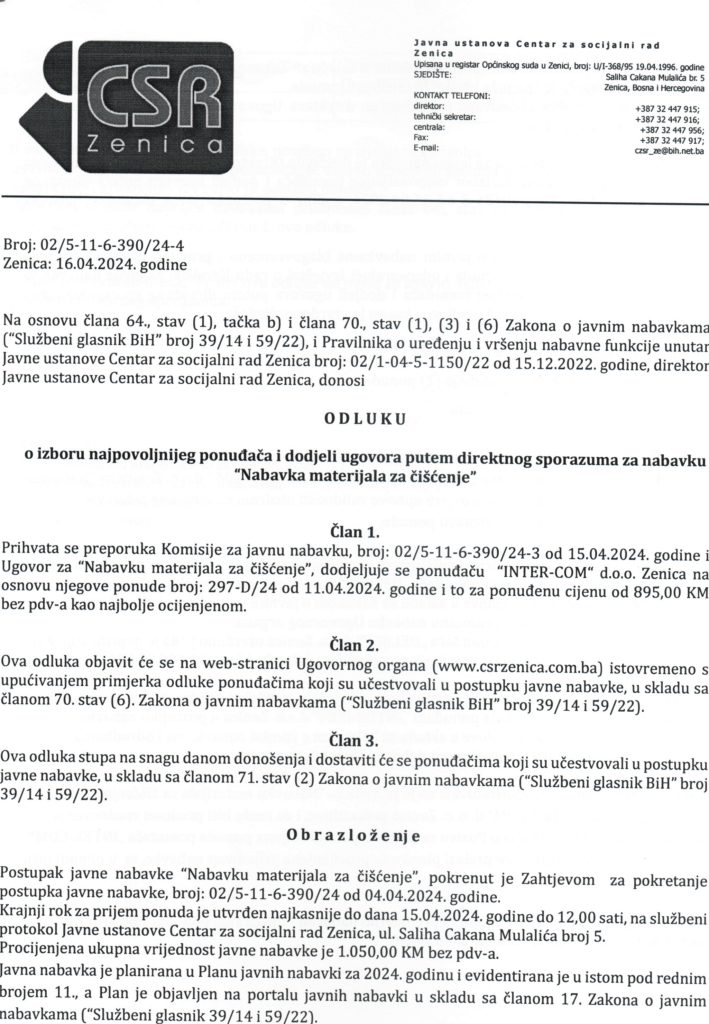 Odluka o izboru najpovoljnijeg ponuđača i dodjeli ugovora putem direktnog sporazuma za “Nabavku materijala za čišćenje”