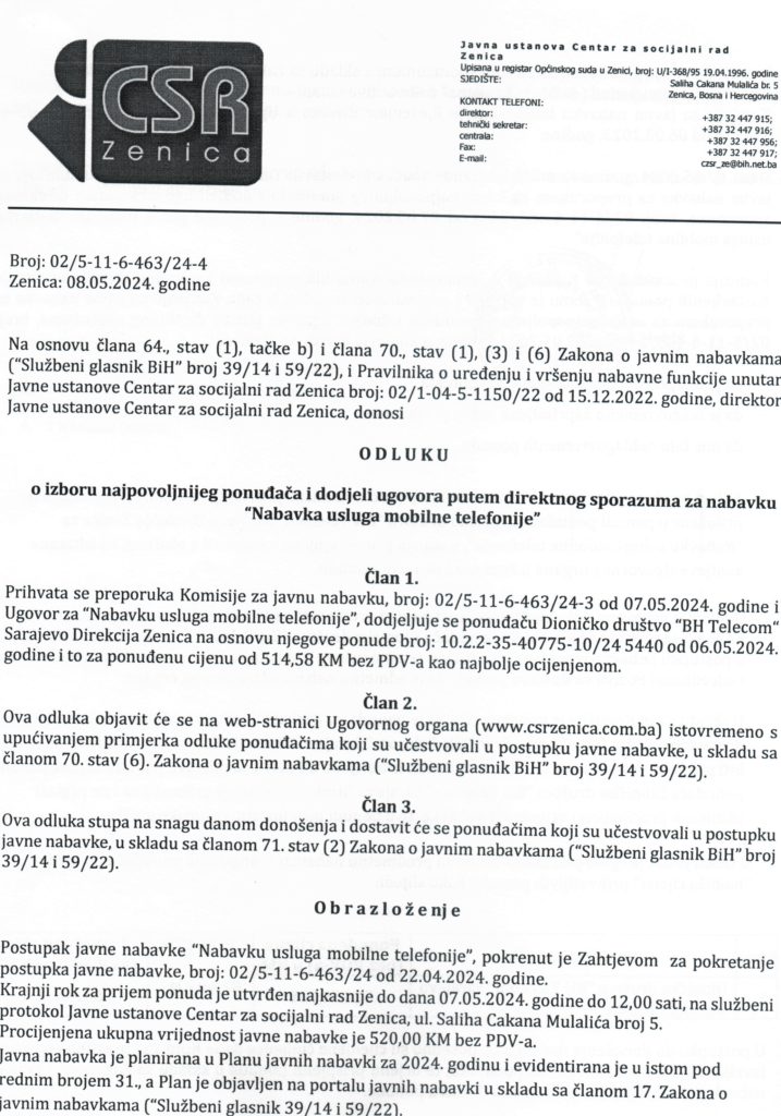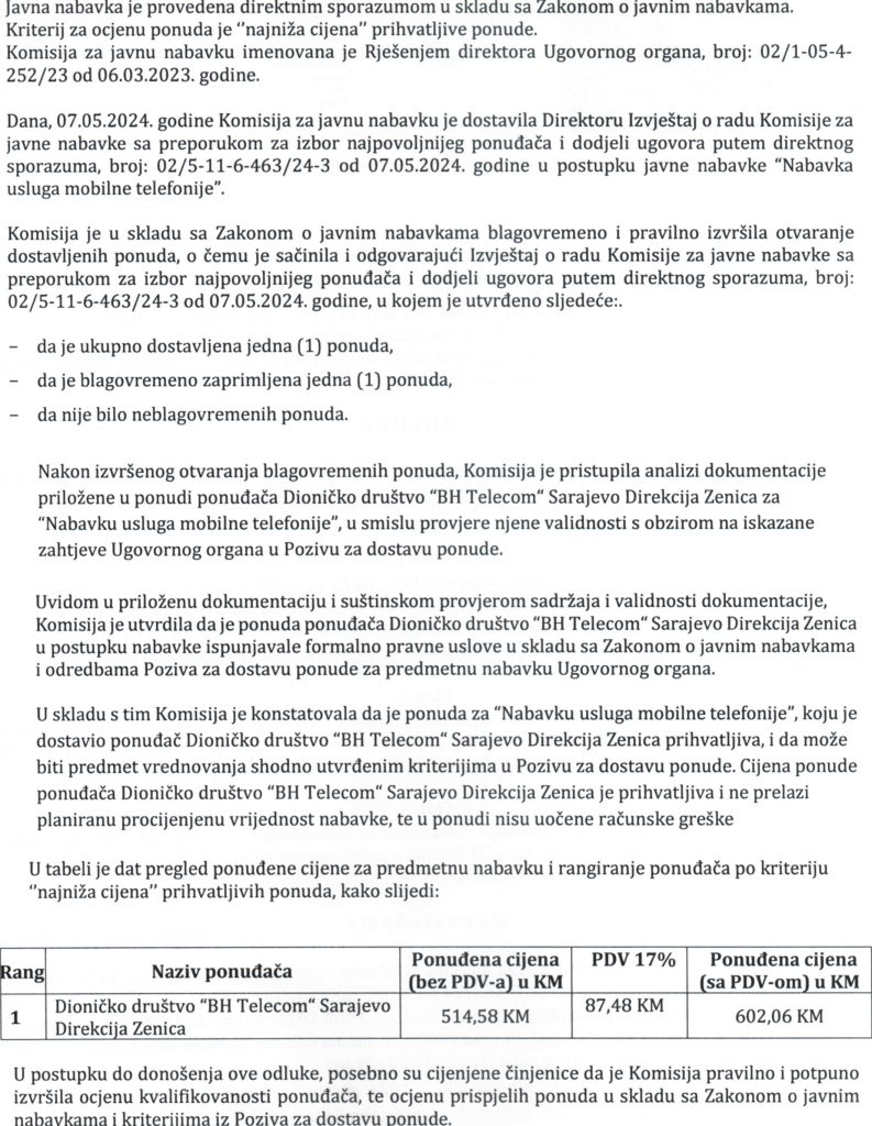 Odluka o izboru najpovoljnijeg ponuđača i dodjeli ugovora putem direktnog sporazuma za “Nabavku usluga mobilne telefonije”