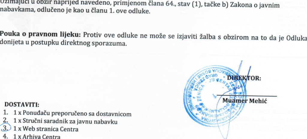 Odluka o izboru najpovoljnijeg ponuđača i dodjeli ugovora putem direktnog sporazuma za “Nabavku usluga objavljivanja oglasa u dnevnim novinama”