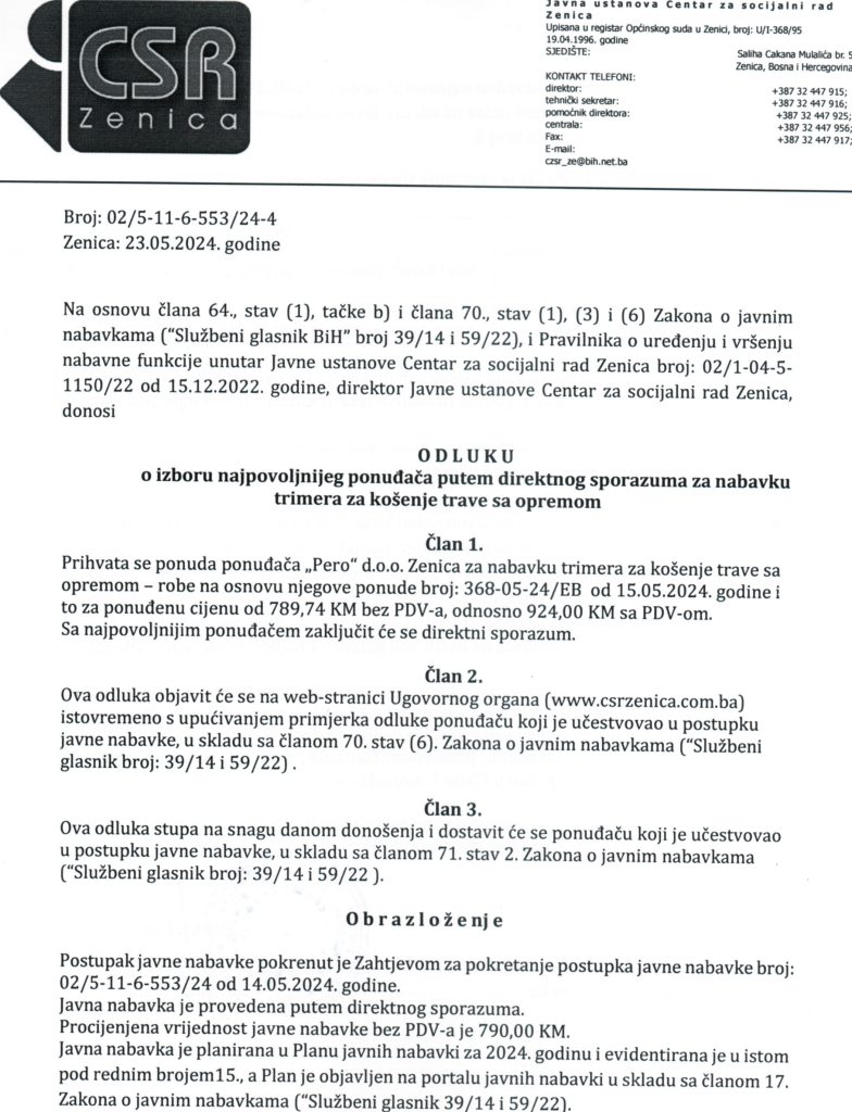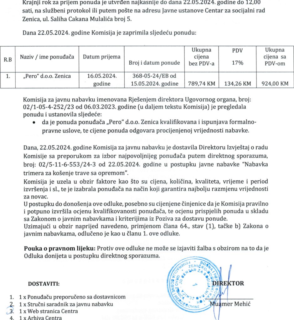 Odluka o izboru najpovoljnijeg ponuđača putem direktnog sporazuma za “Nabavku trimera za košenje trave sa opremom”