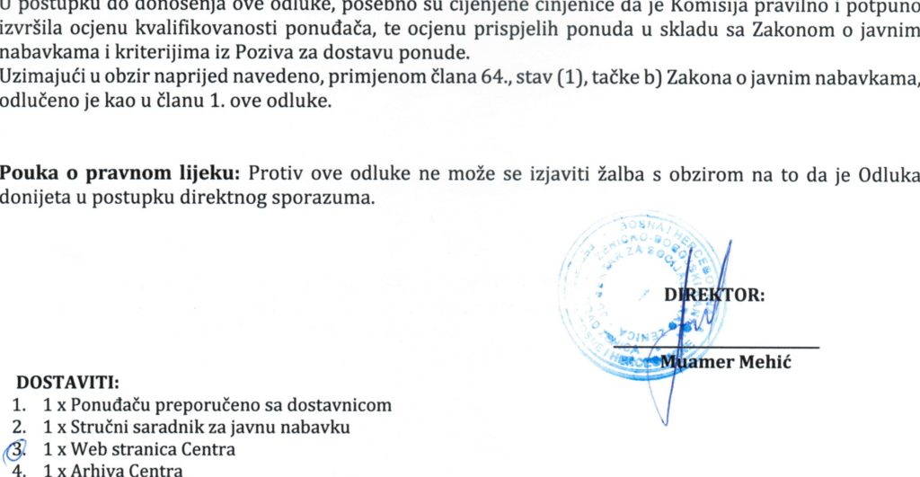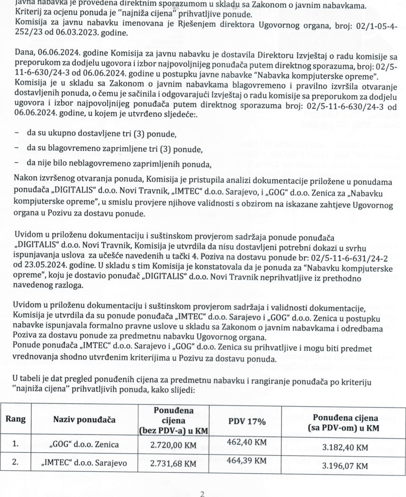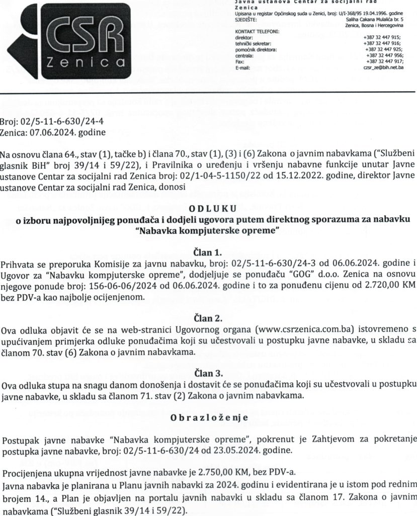 Odluka o izboru najpovoljnijeg ponuđača i dodjeli ugovora putem direktnog sporazuma za “Nabavku kompjuterske opreme”