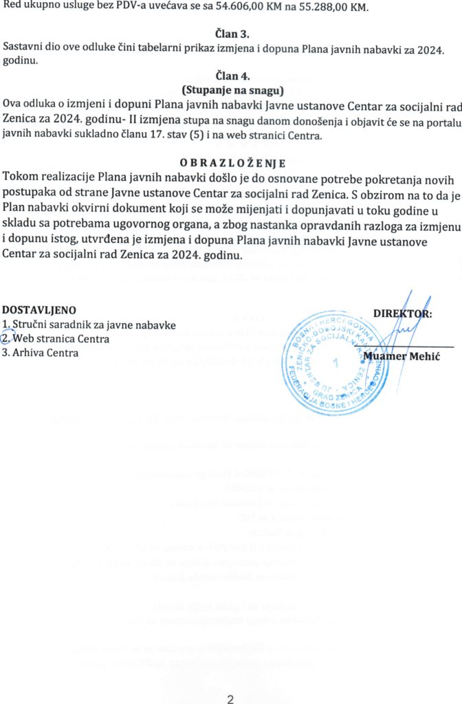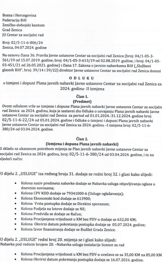 o izmjeni i dopuni Plana javnih nabavki Javne ustanove Centar za socijalni rad Zenica za 2024. godinu – II izmjena