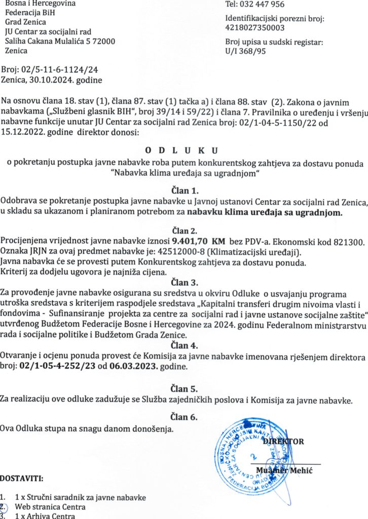 Odluka o pokretanju postupka javne nabavke “Nabavka klima uređaja sa ugradnjom”