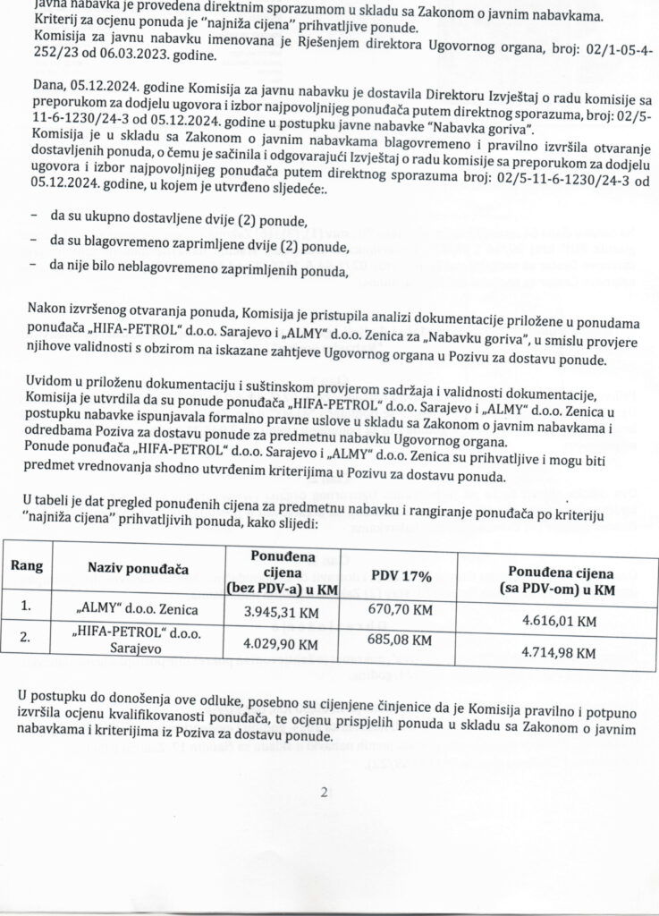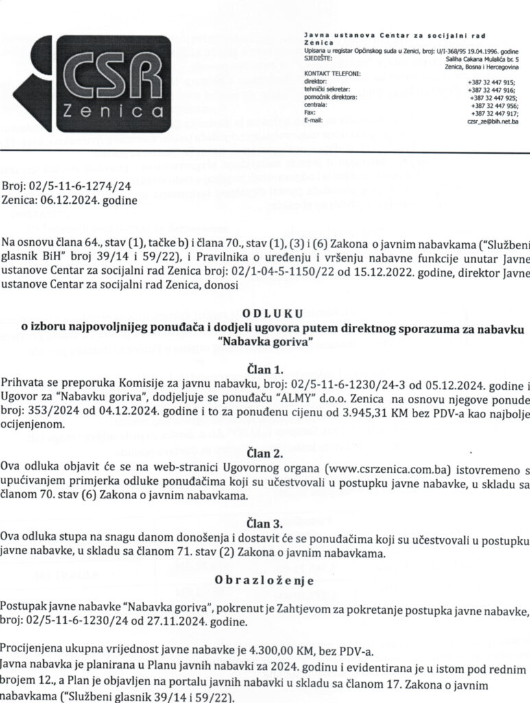 Odluka o izboru najpovoljnijeg ponuđača i dodjeli ugovora putem direktnog sporazuma za “Nabavku goriva”