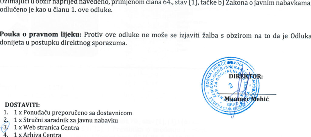 Odluka o izboru najpovoljnijeg ponuđača i dodjeli ugovora putem direktnog sporazuma za “Nabavku usluga tehničke zaštite zaposlenika i imovine”