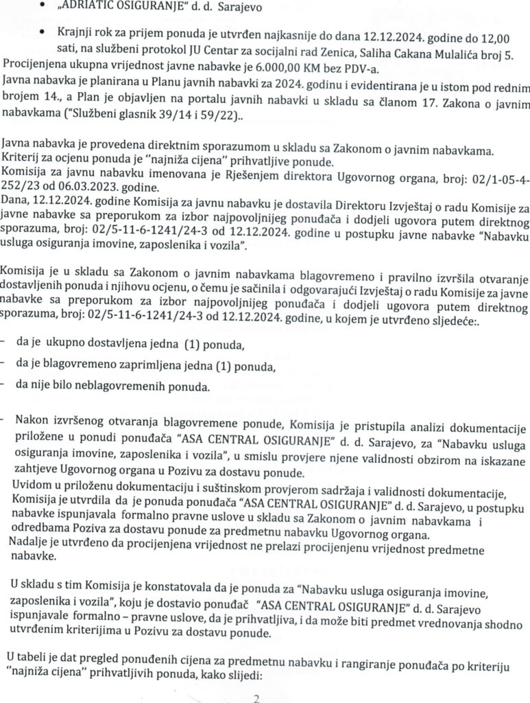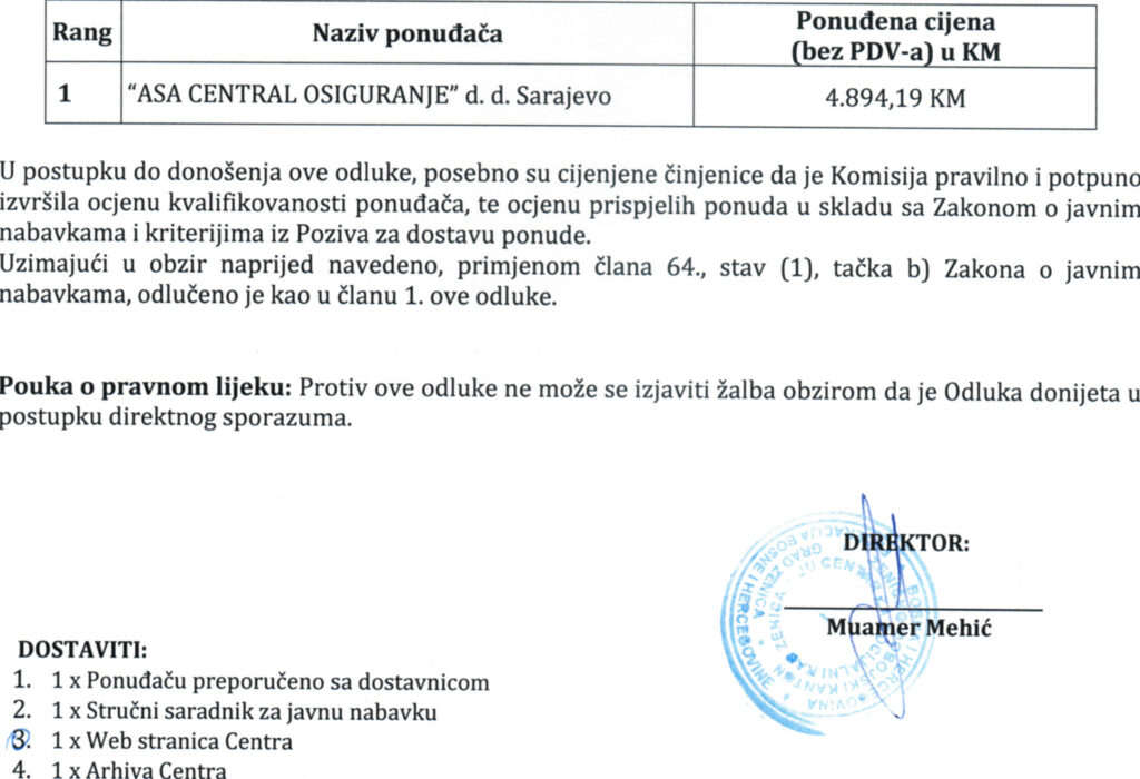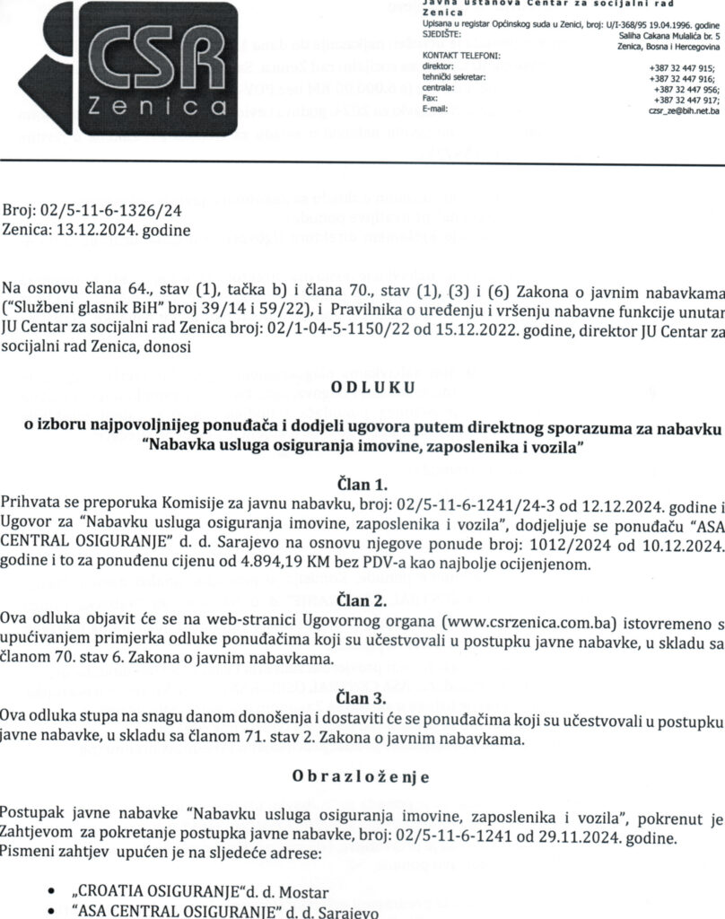 Odluka o izboru najpovoljnijeg ponuđača i dodjeli ugovora putem direktnog sporazuma za “Nabavku usluga osiguranja imovine, zaposlenika i vozila”