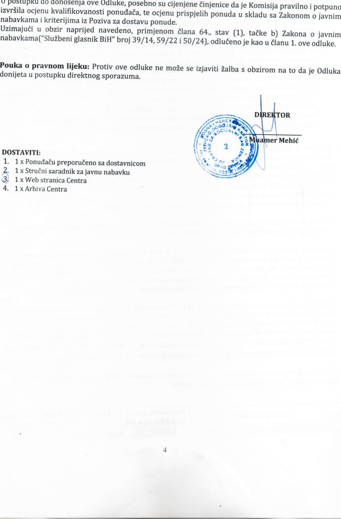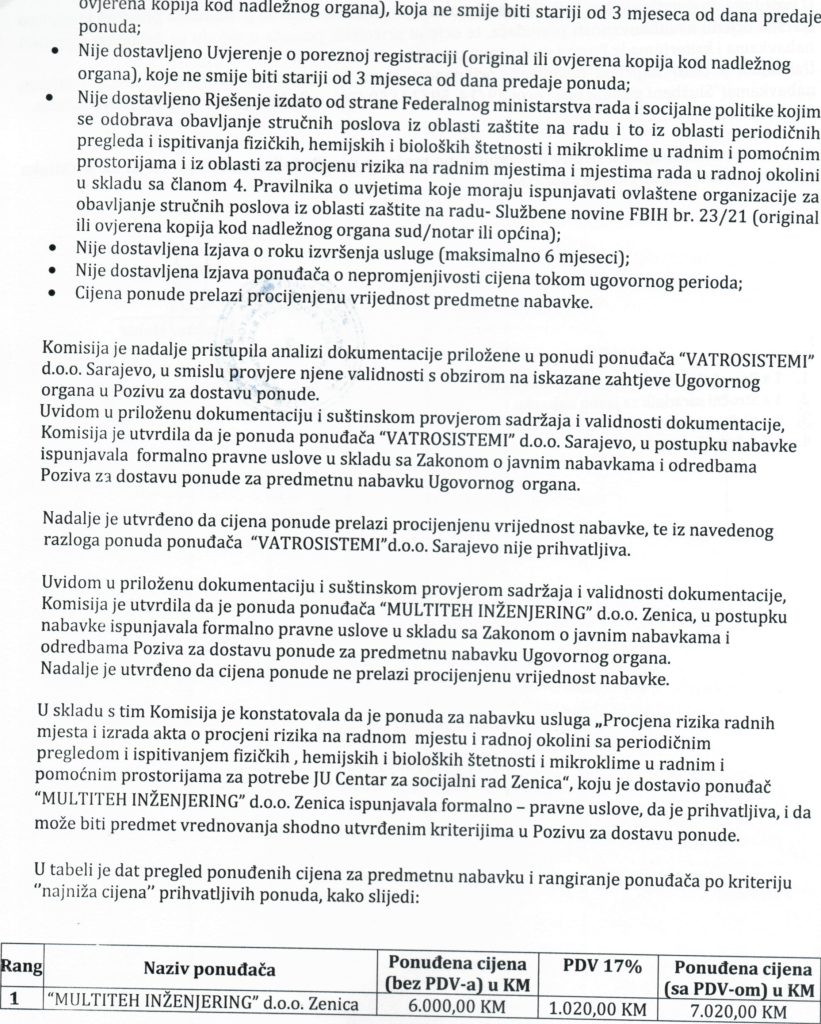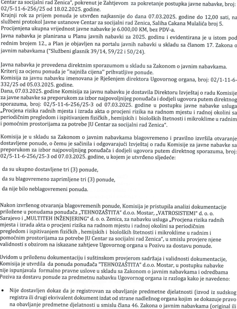 Odluka o izboru najpovoljnijeg ponuđača i dodjeli ugovora putem direktnog sporazuma za nabavku usluga “Procjene rizika radnih mjesta i izrada akta o procjeni rizika na radnom mjestu i radnoj okolini sa periodičnim pregledom i ispitivanjem fizičkih, hemijskih i bioloških štetnosti i mikroklime u radnim i pomoćnim prostorijama za potrebe JU Centar za socijalni rad Zenica”