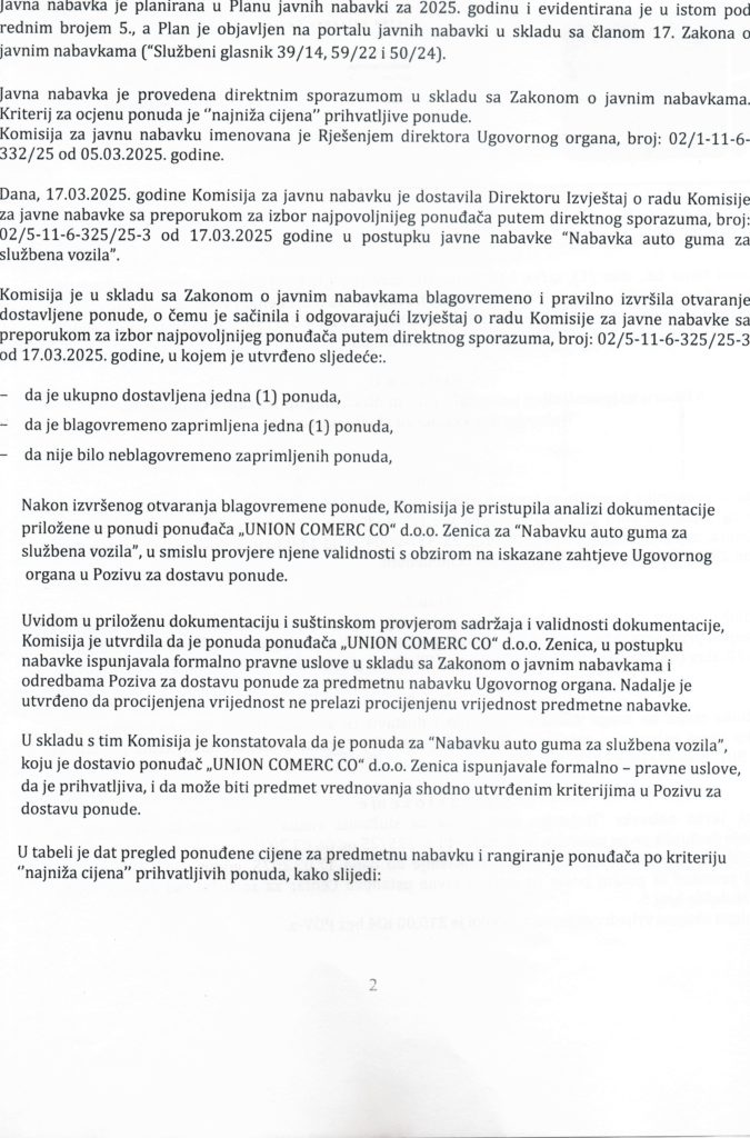 Odluka o izboru najpovoljnijeg ponuđača putem direktnog sporazuma za “Nabavku auto guma za službena vozila”