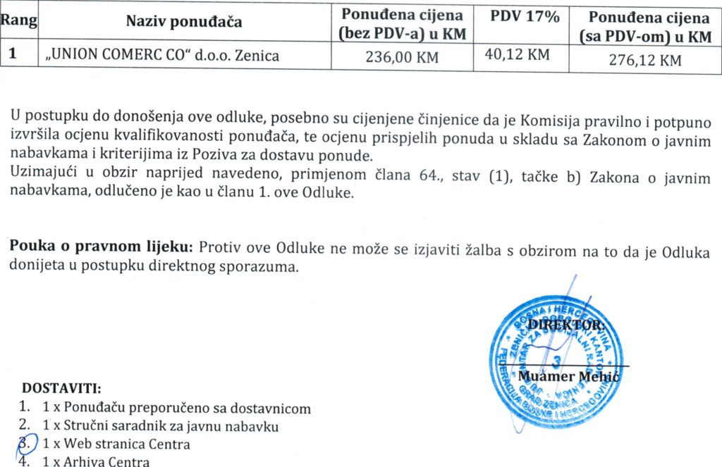 Odluka o izboru najpovoljnijeg ponuđača i dodjeli ugovora putem direktnog sporazuma za “Nabavka materijala za čišćenje”
