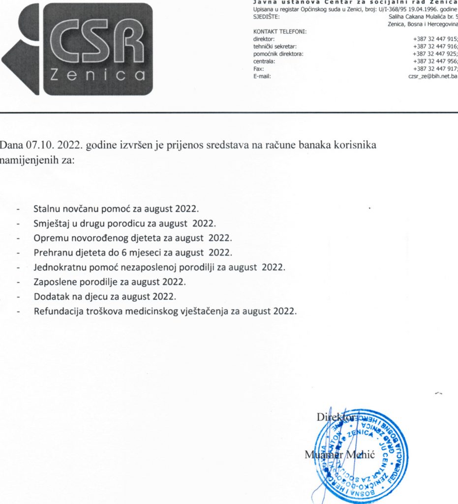Prijenos naknada koje finansira Zeničko-dobojski kanton za august 2022. godine